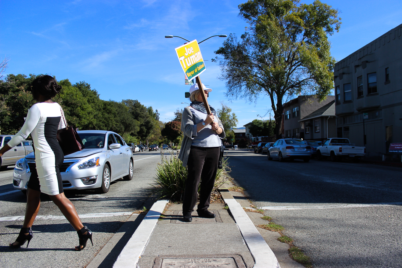 Retired Oakland resident Susan Black wore a Joe Tuman hat as she waved a sign in support of his campaign at the corner of 51st Street and Telegraph. Black said she is pulling for Tuman because he is not part of Oakland’s current political system. She likes Tuman’s declared goal of making the city safer by putting 900 police officers on the streets without raising taxes. “I’m tired of the same old thing,” Black said. She said she had never campaigned before, “but he’s worth it.”