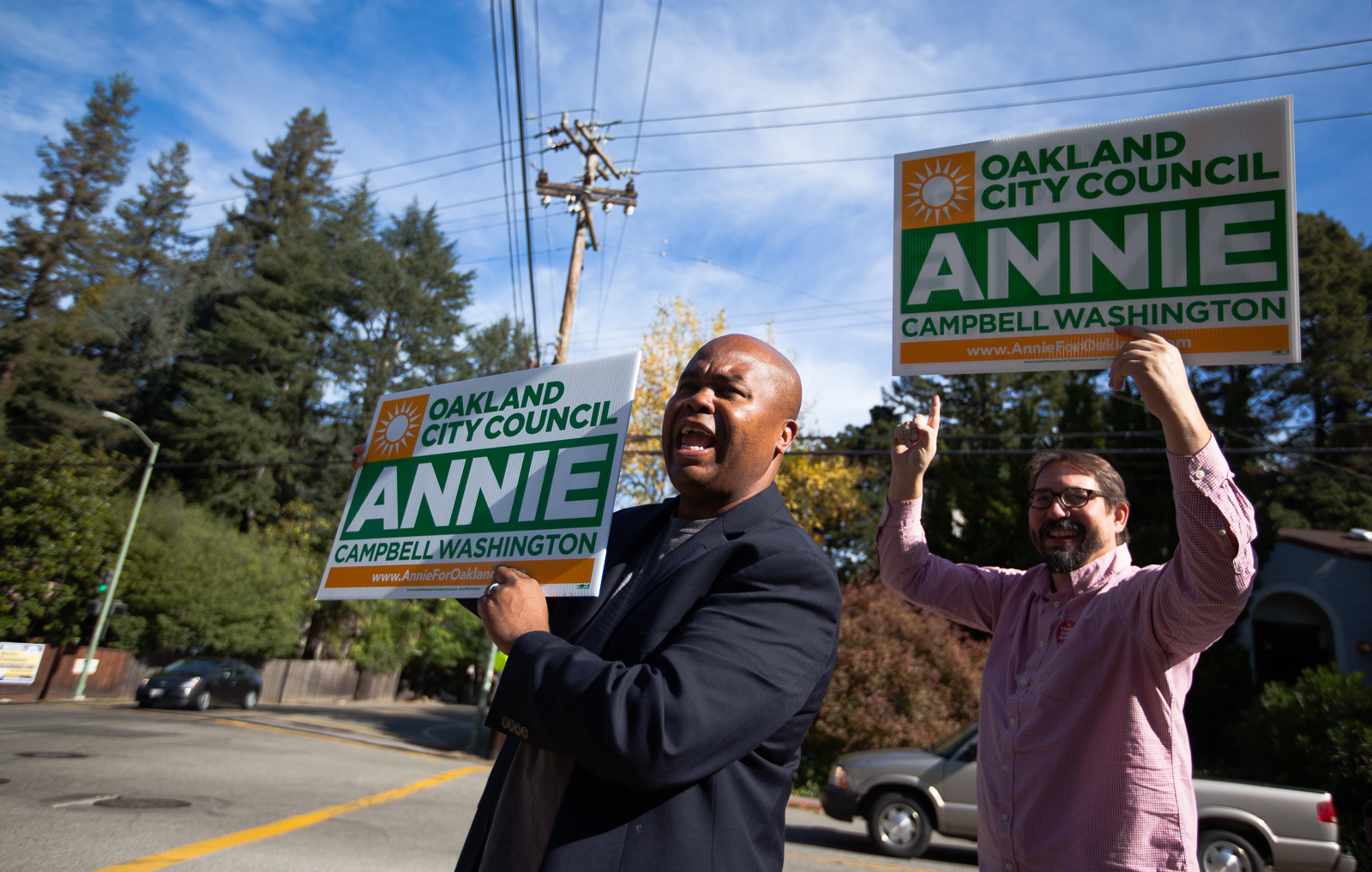 At 10:15 a.m., Mark Ristich, 47, stood across the street from the Montclair Women’s Club holding a sign that read “Annie Campbell Washington, Oakland City Council,” indicating his support for the candidate for the District 4 seat. Ristich works for the radio program Snap Judgment, and campaigning next to him was the program’s host, Glynn Washington, who is also the candidate’s husband. As they stood chatting, a car slowed down and a woman honked and yelled “I voted for her!”