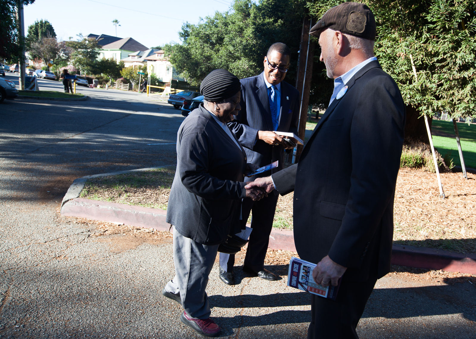 - Dan Siegel greets voters as they walk through the Mosswood Recreation Center parking lot to their polling place around 2 p.m. Siegel introduces himself and asks for votes, alongside Pastor Harold Mayberry, who has been working on the campaign since its beginning. Photo by Gina Pollack.
