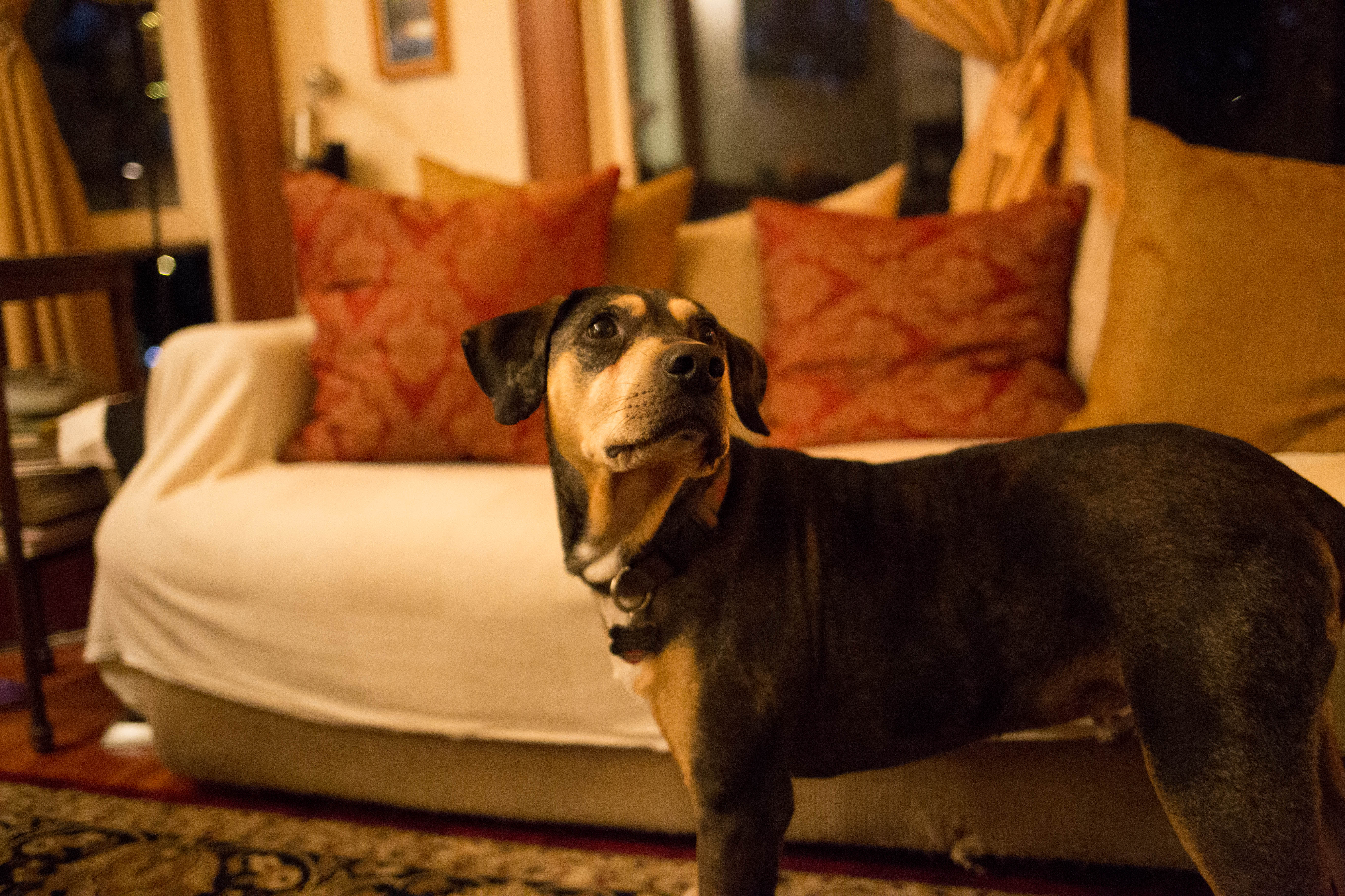 - Einstein, Oakland’s canine candidate, at his election party at home. Photo by Nina Zou.