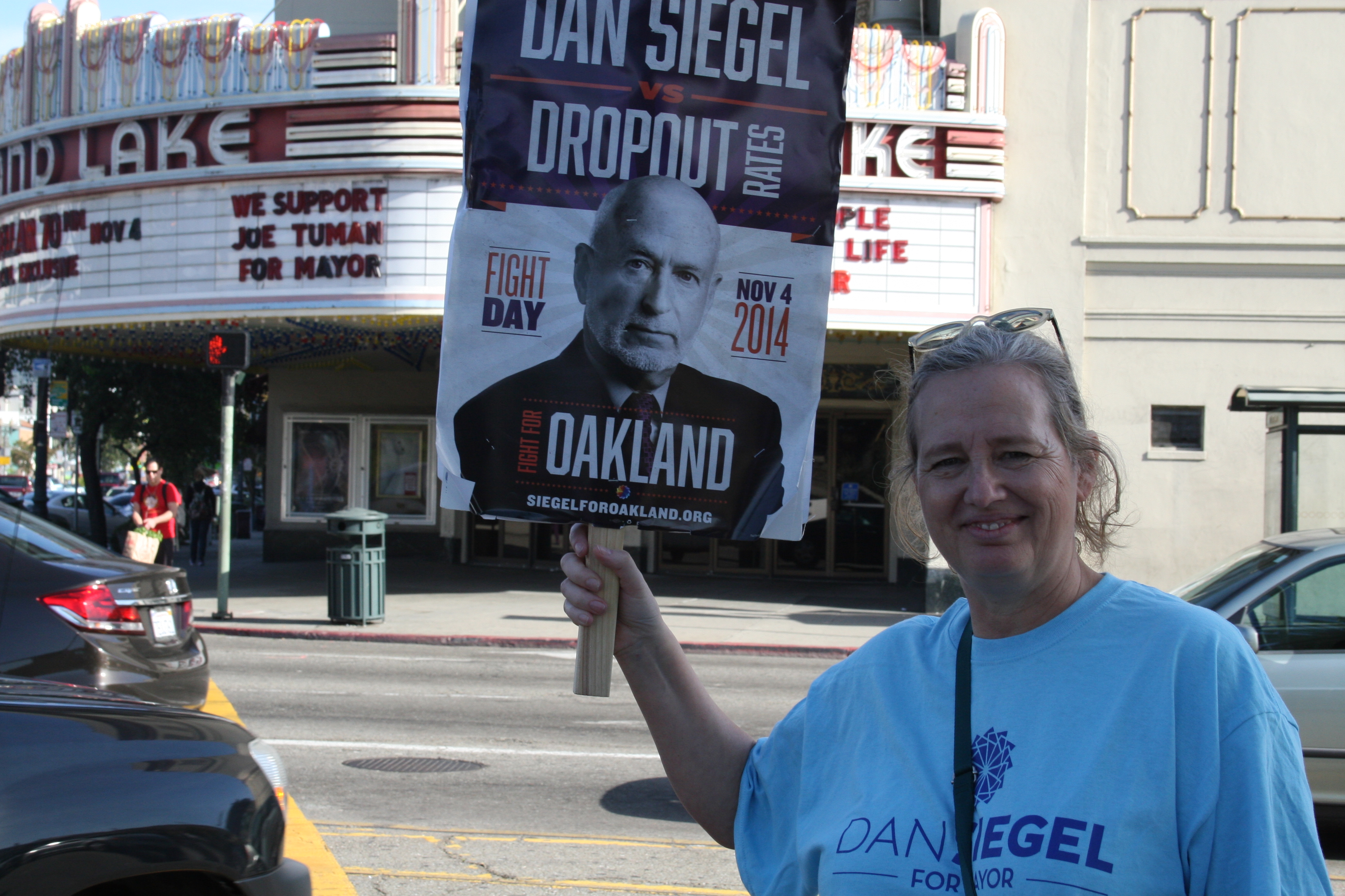 - Natasha Dean demonstrates her support for Dan Siegal outside Grand Lake Theater, which displays a conflicting sign in support of mayoral candidate Joe Tuman. Photo by Joshua Escobar.