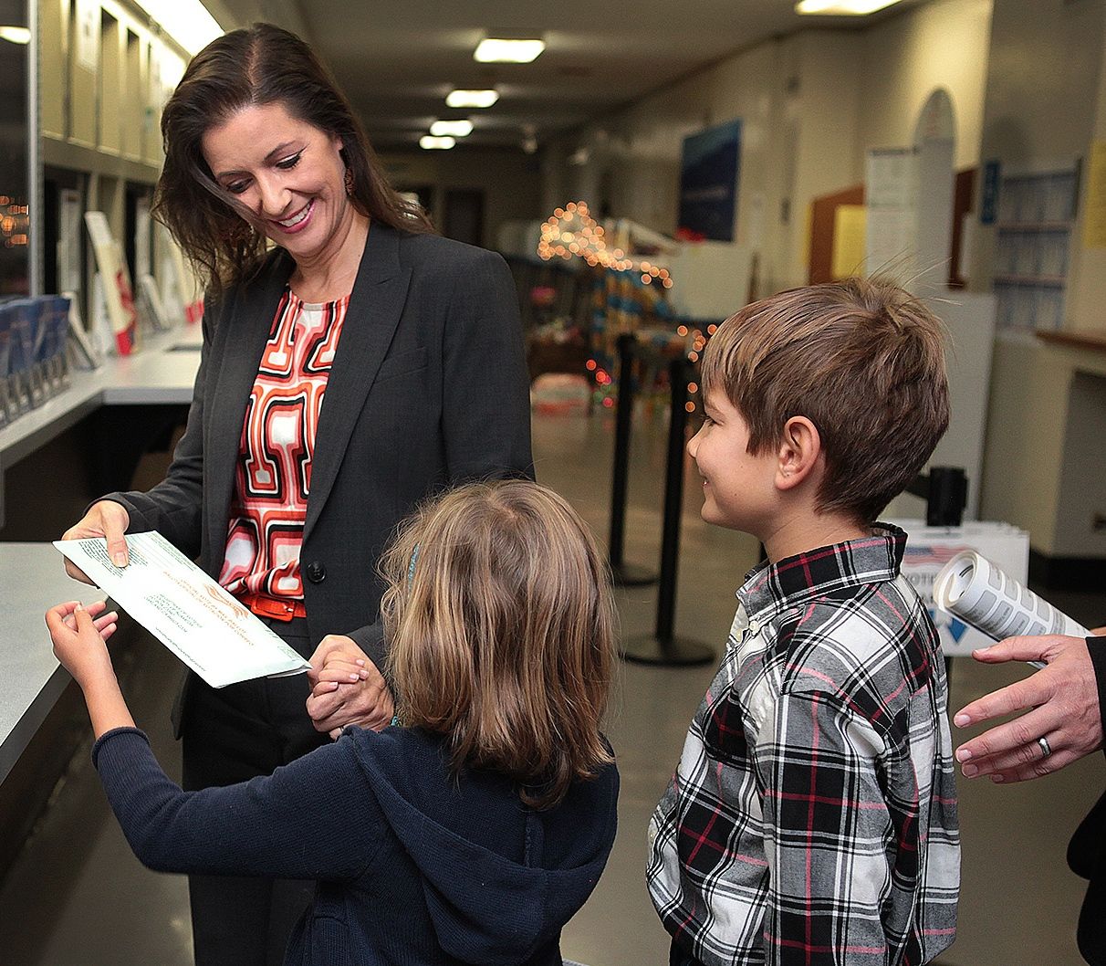 - Mayoral candidate Libby Schaaf stands with her daughter, Lena, 7, and son, Dominic, 9, as she casts her ballot at the Alameda County Registrar of Voters Office. Photo by Deana Mitchell.