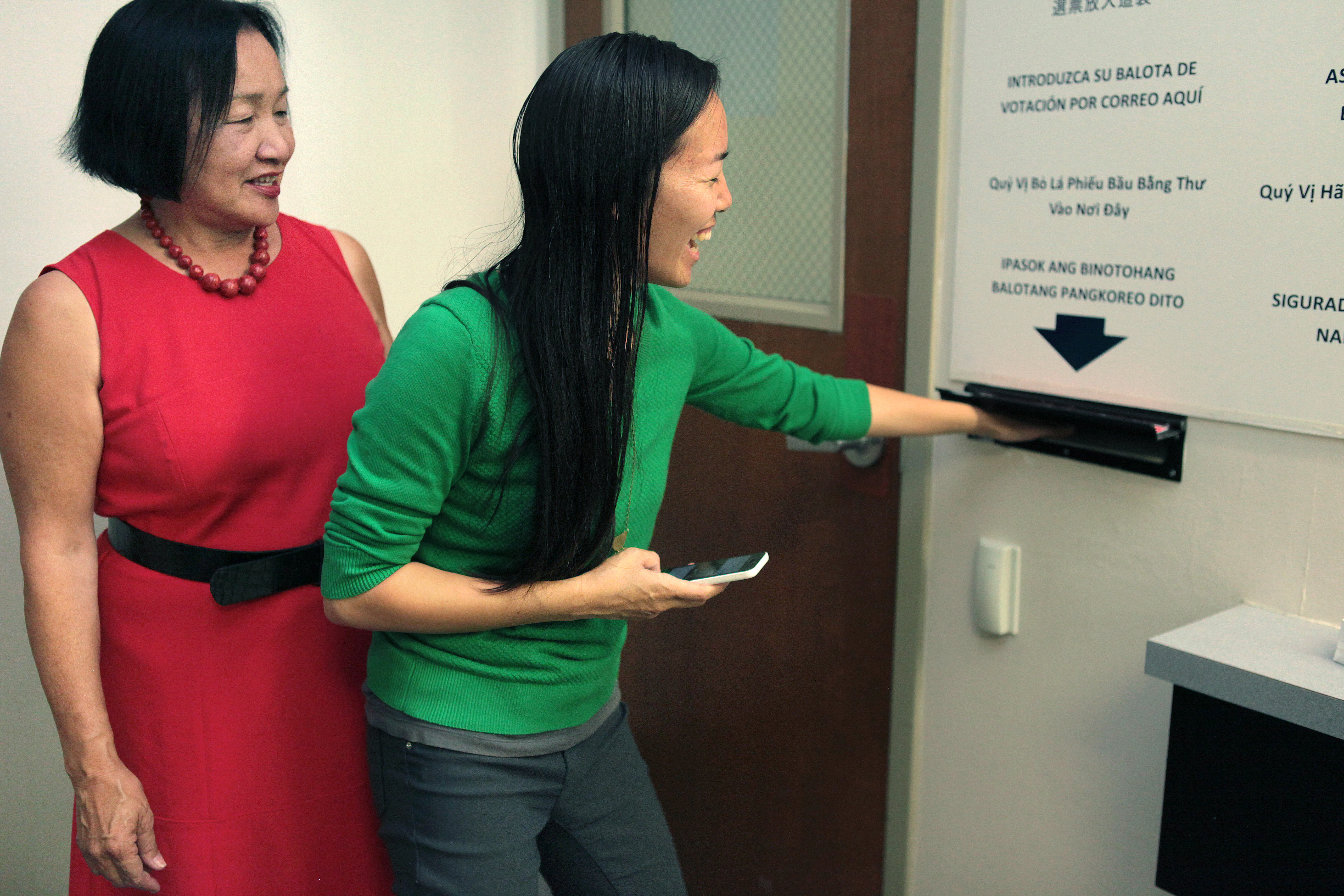- Current Oakland Mayor Jean Quan, left, watches as her daughter, Lailan Huen, gives her ballot an extra shove at the Alamada County Registrar of Voters Office. Photo by Deana Mitchell.