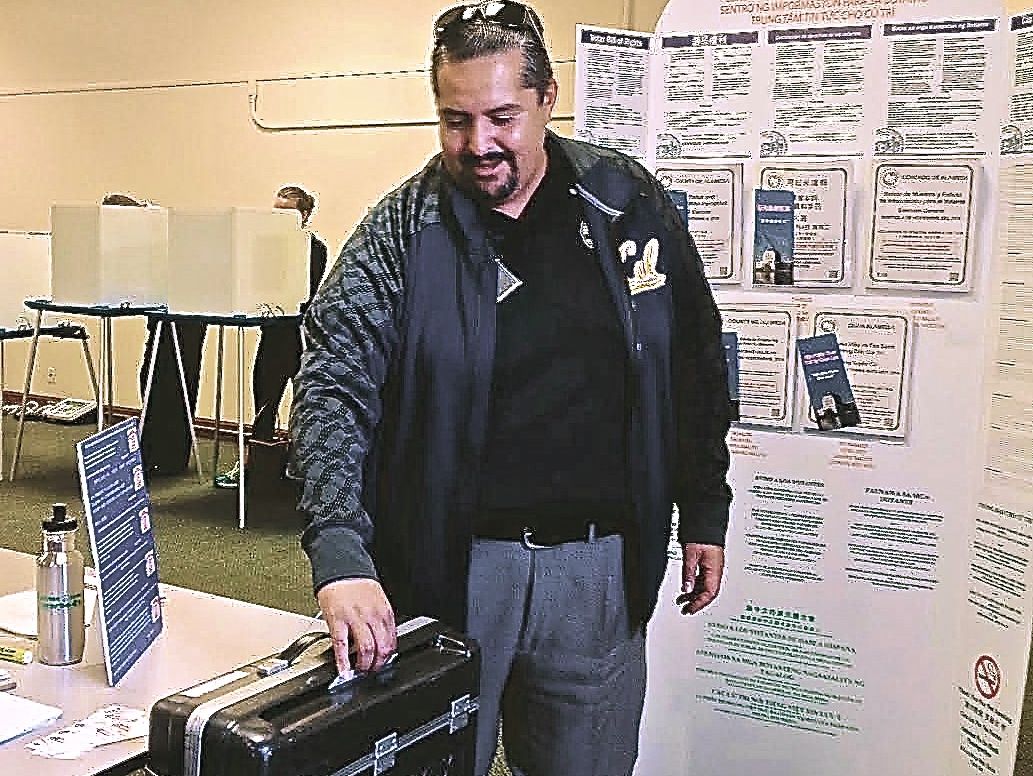 - Oakland District 2 City Council candidate Abel Guillén drops off his ballot at the Oakland Main Library polling station. Photo by Romin Lee Johnson.