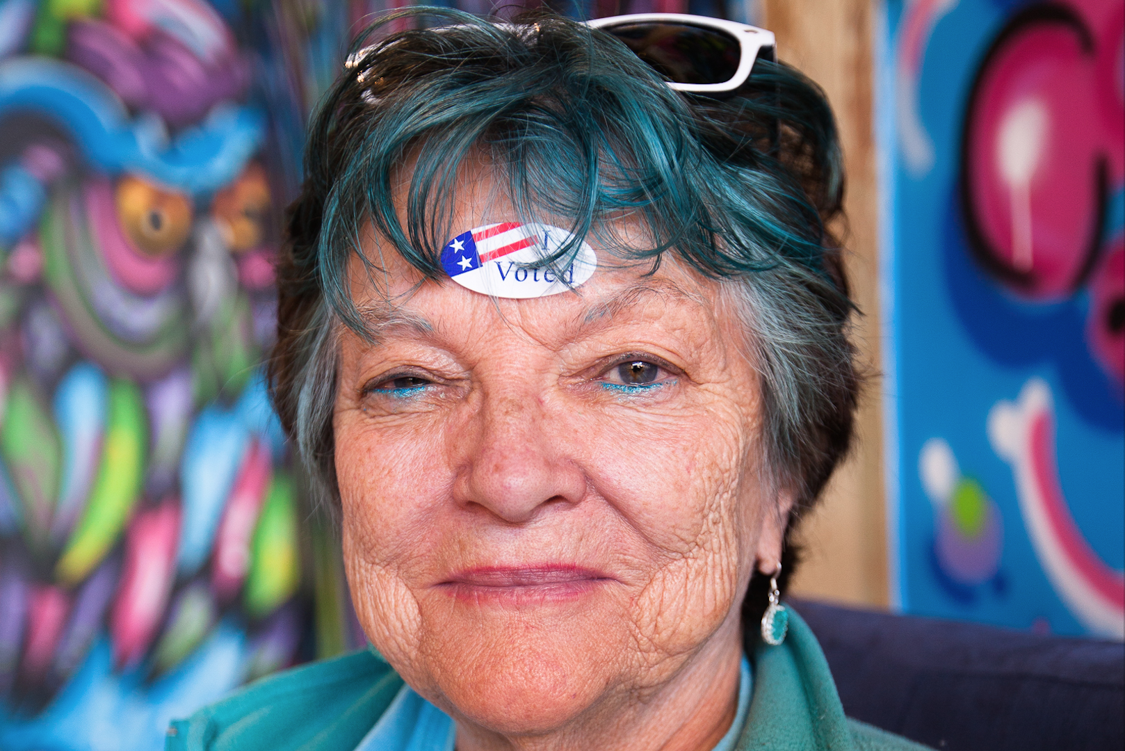 - Volunteer Lakshmi Kerner, at Dan Siegal headquarters. Kerner who’s 76 “going on 40,” shows off her blue hair, blue nail polish, blue shoes, and blue glasses. “Girls just wanna have fun, no matter what age we are.” Photo by Gina Pollack.