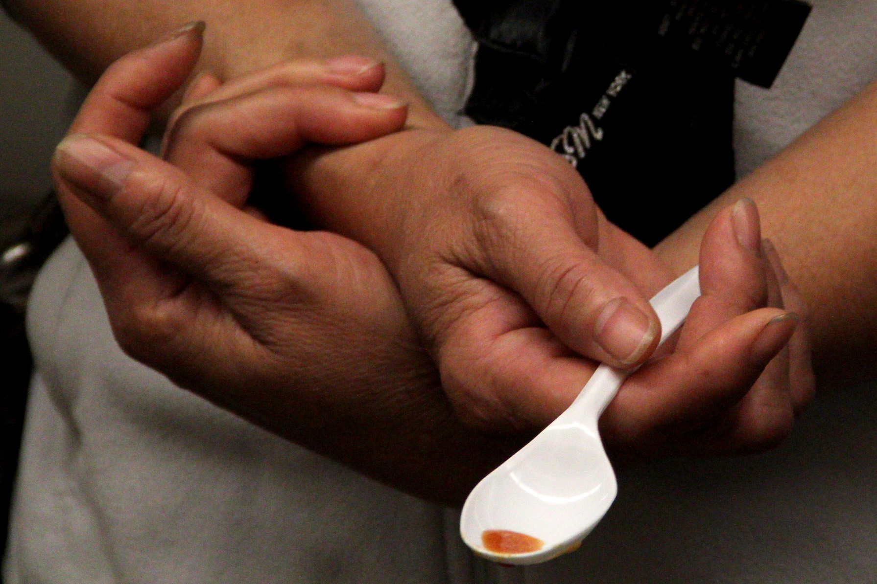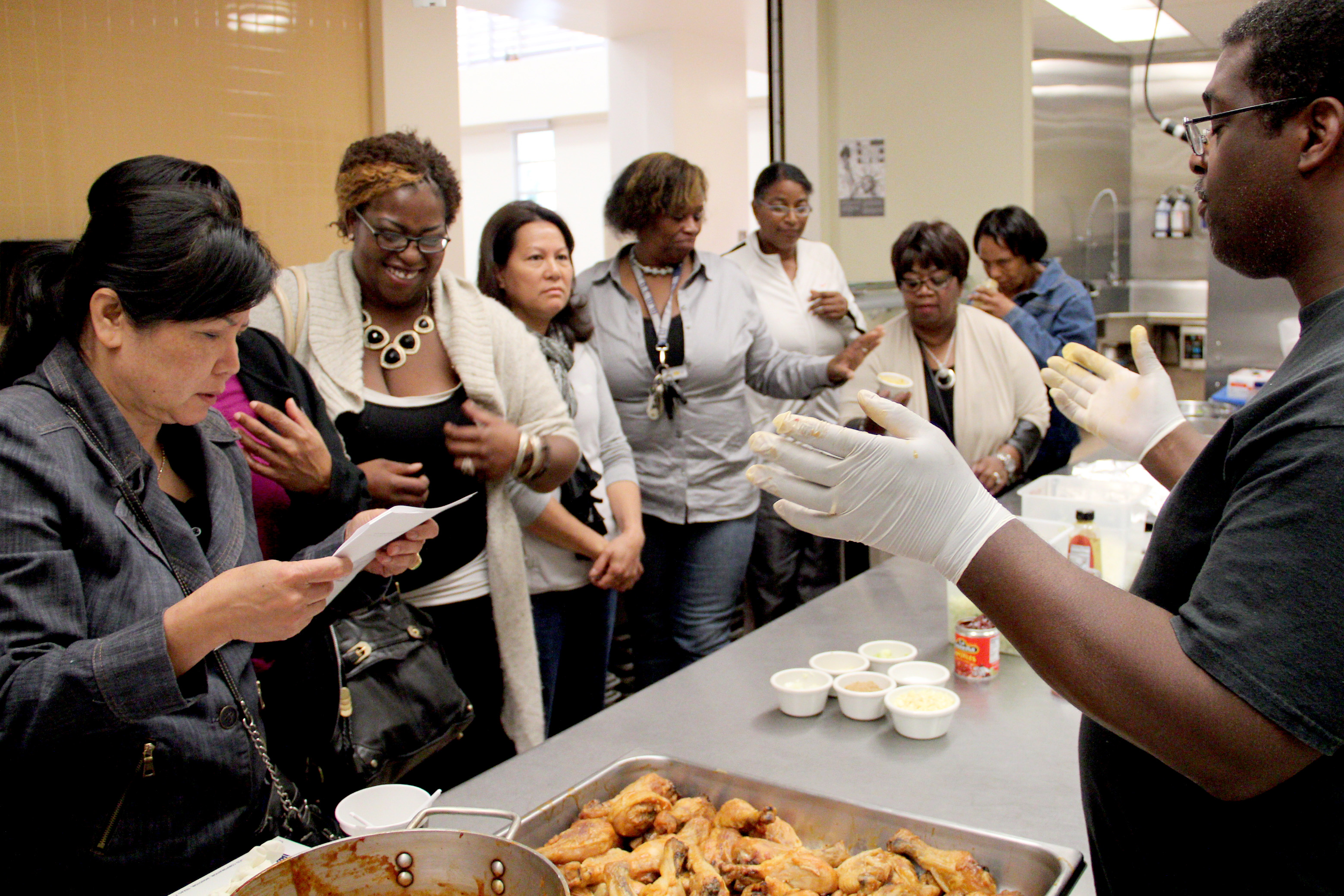 - Emelda Kirkpatrick (foreground) studies the educational materials alongside other Oakland school cooks at a recipe training at La Escuelita Elementary School.