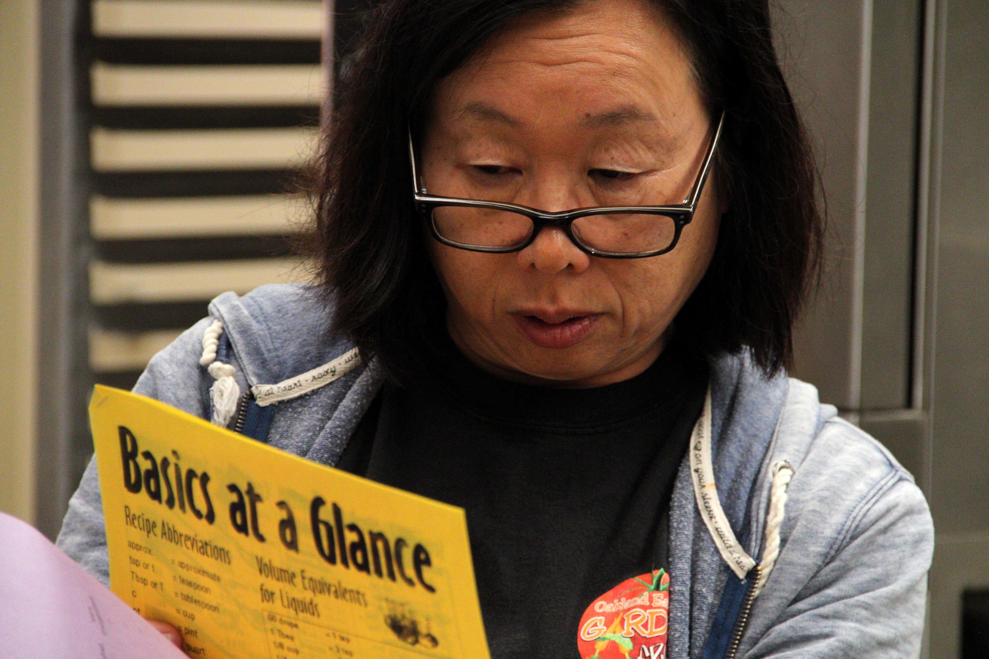- Joyce Peters, a dietician from Oakland Unified school district, checks the reference materials during a recipe training for school cooks.
