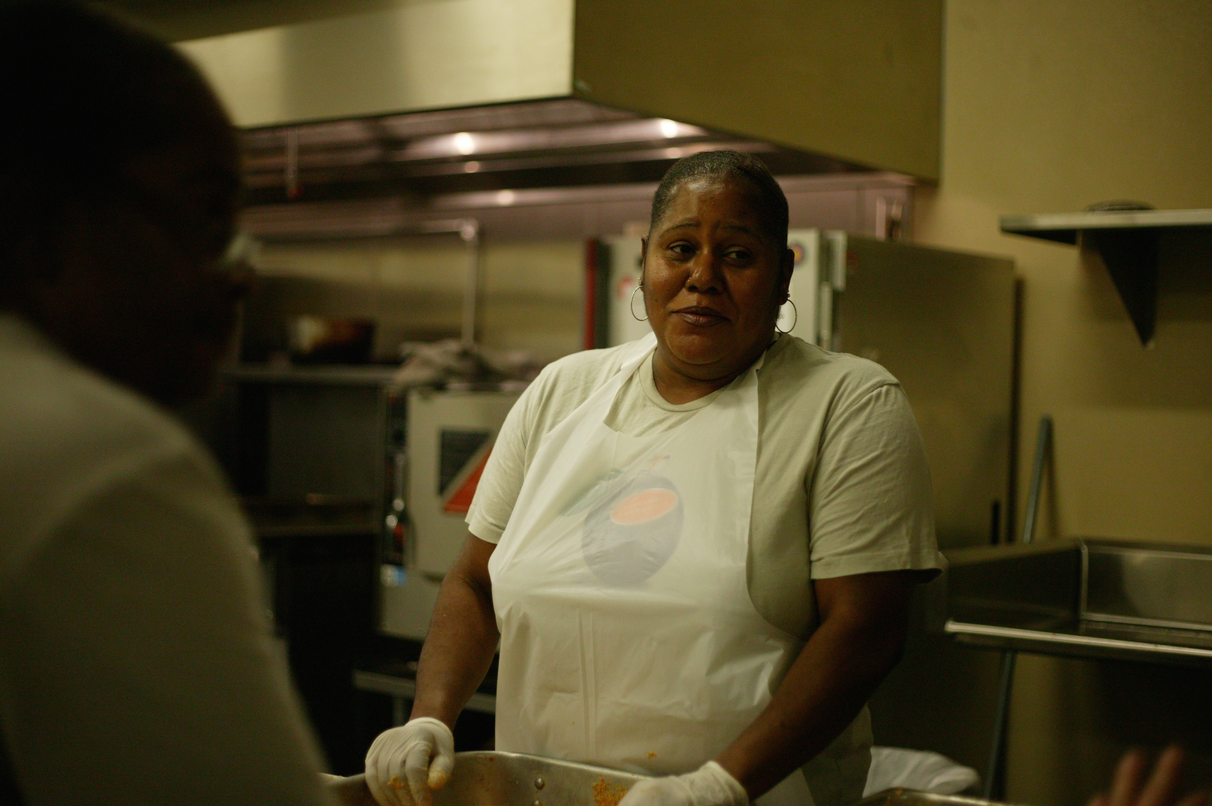 - Tamara Purifoy, kitchen manager at West Oakland Middle School, says preparing California Thursdays recipes isn’t difficult, as long as she’s got the right ingredients. Photo by Ethan Bien.