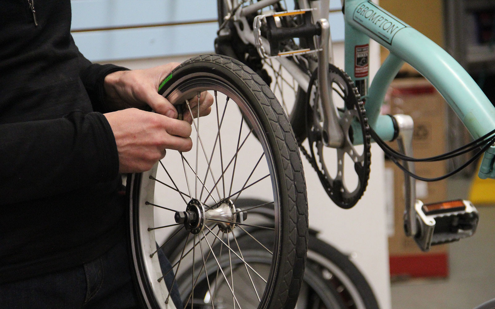 - Co-owner Clay Wagers fixes a bike.