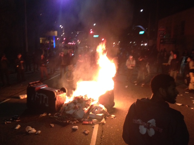 By around 11 pm, the remaining protesters had returned to the downtown area, gathering around 8th and 9th Streets. Someone started a fire in the middle of Broadway between 8th and 7th Street, and people threw rocks into the windows of the Starbucks on Broadway and 8th street and tagged its windows.
