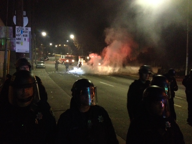 But the crowd didn’t completely break up. Some protesters headed back towards downtown, but others reconvened at MacArthur and Grand. Some formed a drum circle, while others attempted to enter the freeway again, blocking the freeway exit ramp at Grand/Lakeshore Avenue and chanting “Shut it down for Michael Brown.” Nearby, someone set a mattress on fire, and someone else set fire to the contents of a trash bin, as a helicopter shone a bright light on the crowd from overhead.