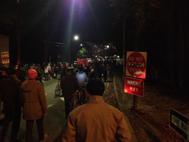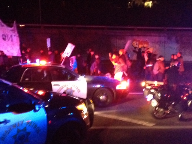The crowd stayed on the freeway until about 9:30 pm, causing a substantial traffic backup, before beginning to disperse. “CHP units stopped traffic on the freeway for the safety of the protesters,” wrote California Highway Patrol Officer Daniel Hill at that time. “With the cooperation of the Oakland Police Department, we managed to clear the freeway and get traffic moving again. The protesters were mostly cooperative.”