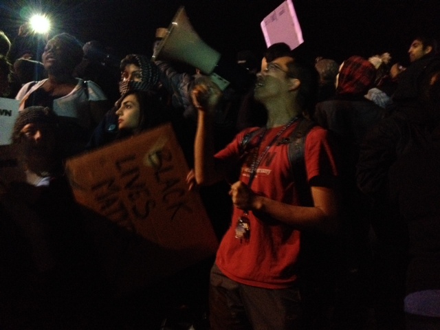 - By 9:30 pm, much of the crowd had dispersed, but some protesters headed back towards the freeway. Photo by Alex Kekauoha.
