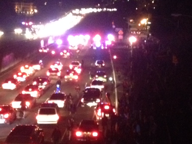 - Protesters on the freeway chanting “Shut it down for Michael Brown!” Photo by Alex Kekauoha.