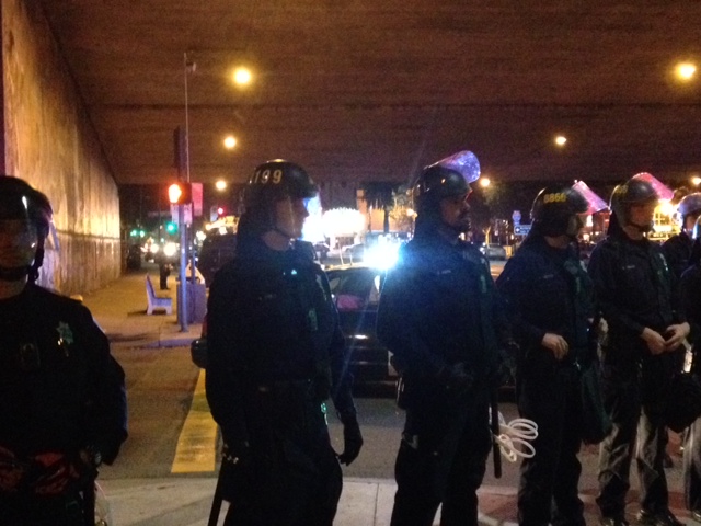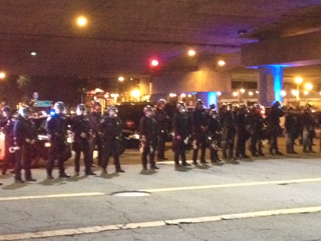 - Police officers lined up in downtown Oakland observing the protest. Photo by Deana Mitchell.