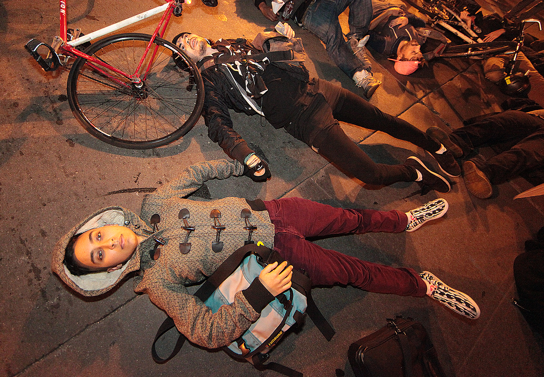 - Roxana Dhada, left, and Elliott Jones lie in the street in protest at 14th and Broadway in downtown Oakland early in the evening. Photo by Deana Mitchell.