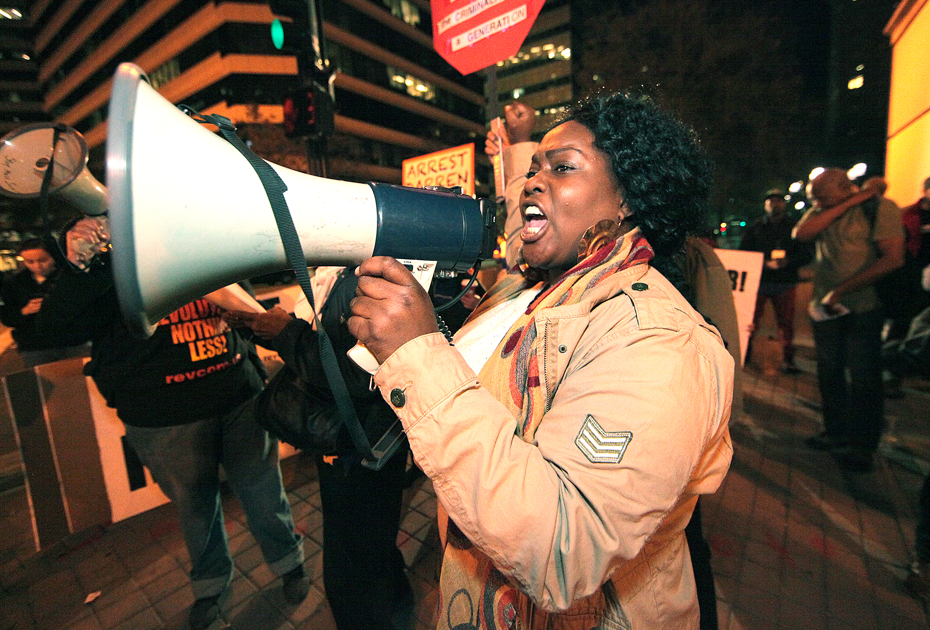 - Cadine Williams leads a crowd of protesters at Broadway and 14th in downtown Oakland, shouting “Indict, convict, send those killer cops to jail.” Photo by Deana Mitchell.