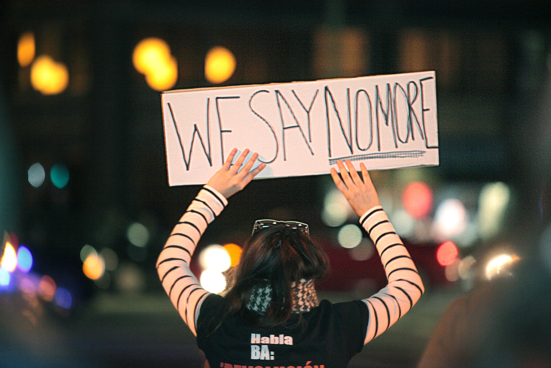 - Nova Tiller holds a sign during a protest in downtown Oakland early in the evening. Photo by Deana Mitchell.