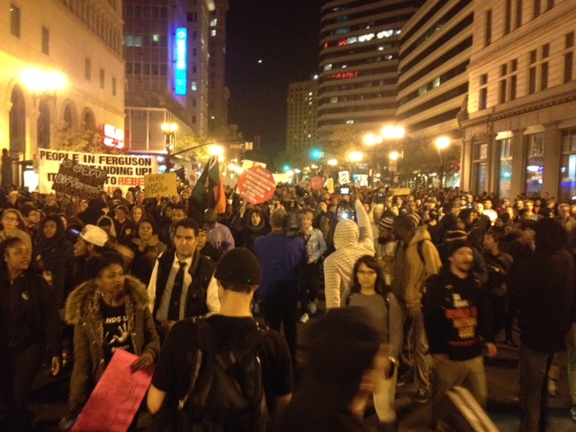 A crowd of protesters filled downtown Oakland Monday night in reaction to the decision by a grand jury in St. Louis, Missouri, not to indict police officer Darren Wilson in the shooting death of Michael Brown.