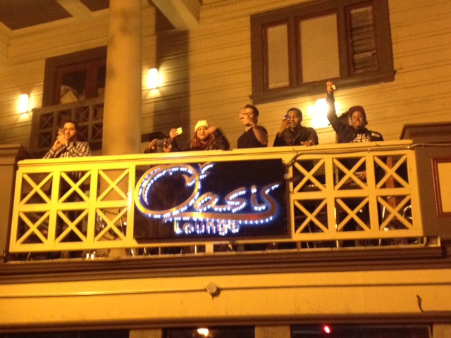 - Patrons at Oasis Lounge on Grand Avenue watching protesters march by. Photo by Alex Kekauoha.