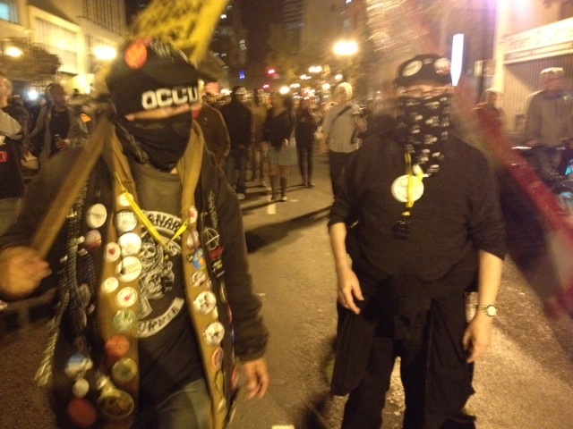 - Protesters in face masks and Occupy garb. Photo by Alex Kekauoha.