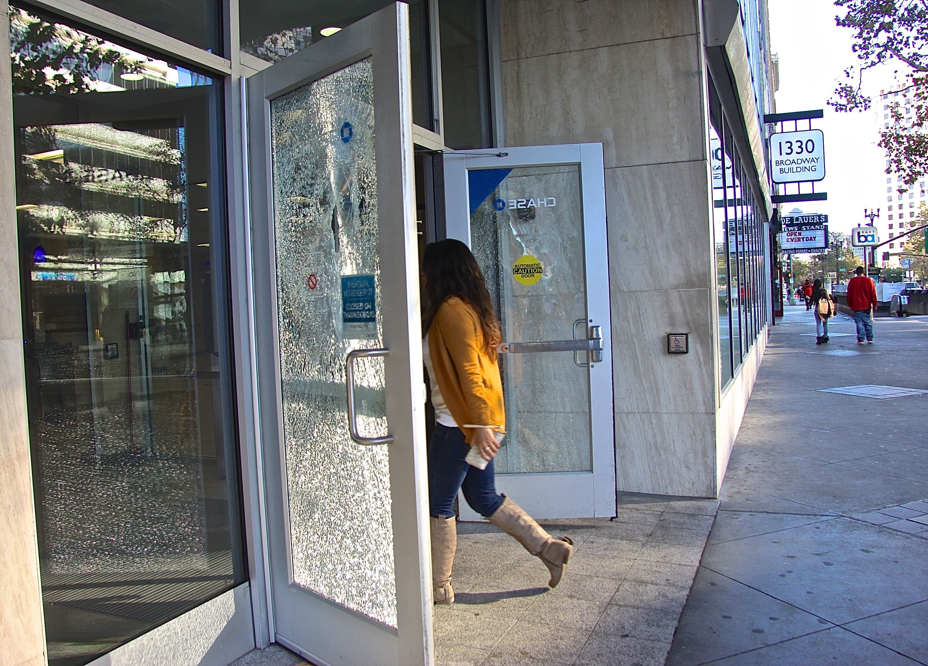 Chase Bank on Broadway and 14th Street was open for business today, despite several broken windows and the shattered glass on the building’s front doors. The Wells Fargo bank, across the street, sustained many broken windows and was under repair this morning.