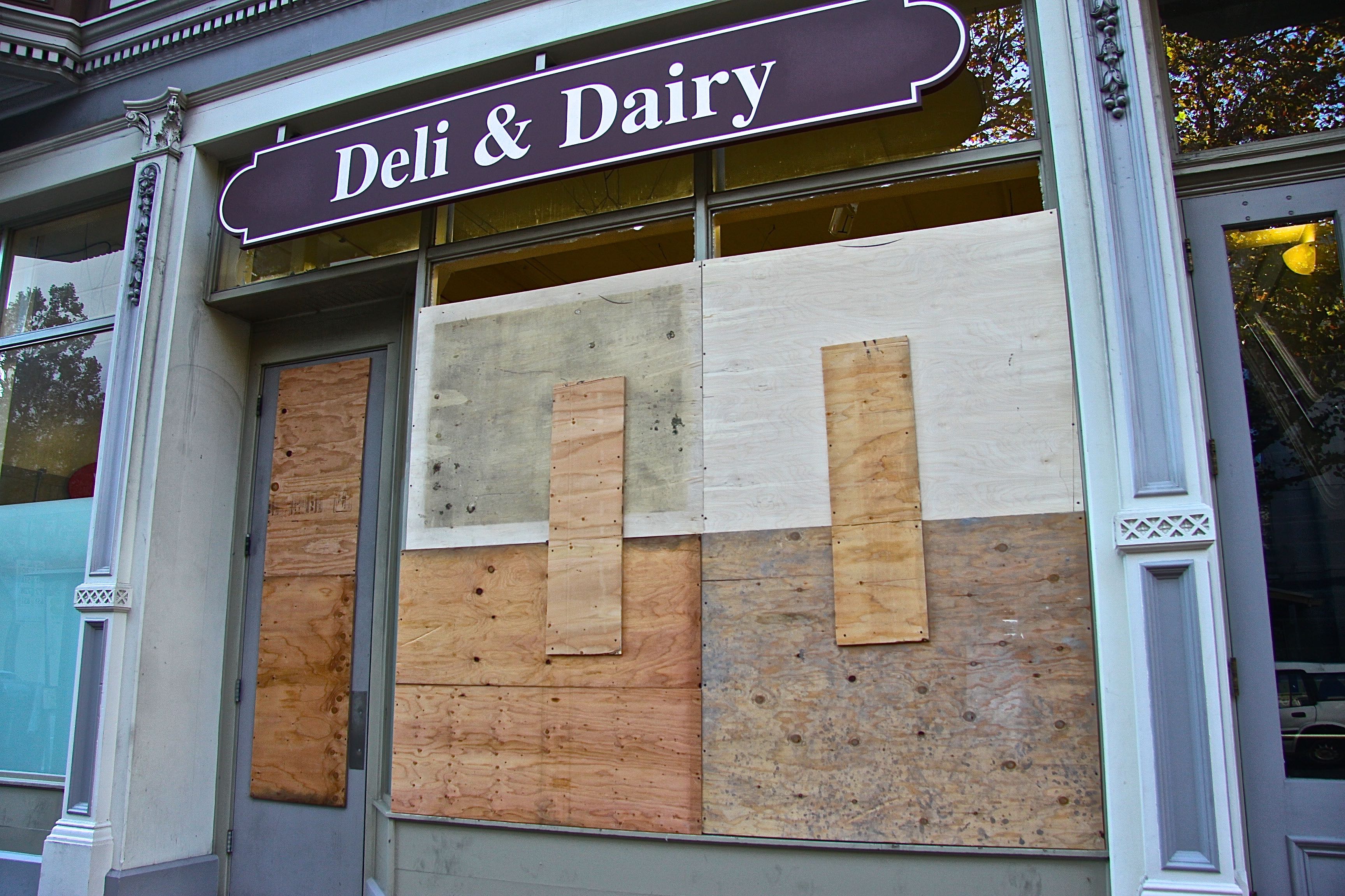 - At the Smart & Final grocery store nearly every window was broken and boarded. Photo by Jacqui Ipp.