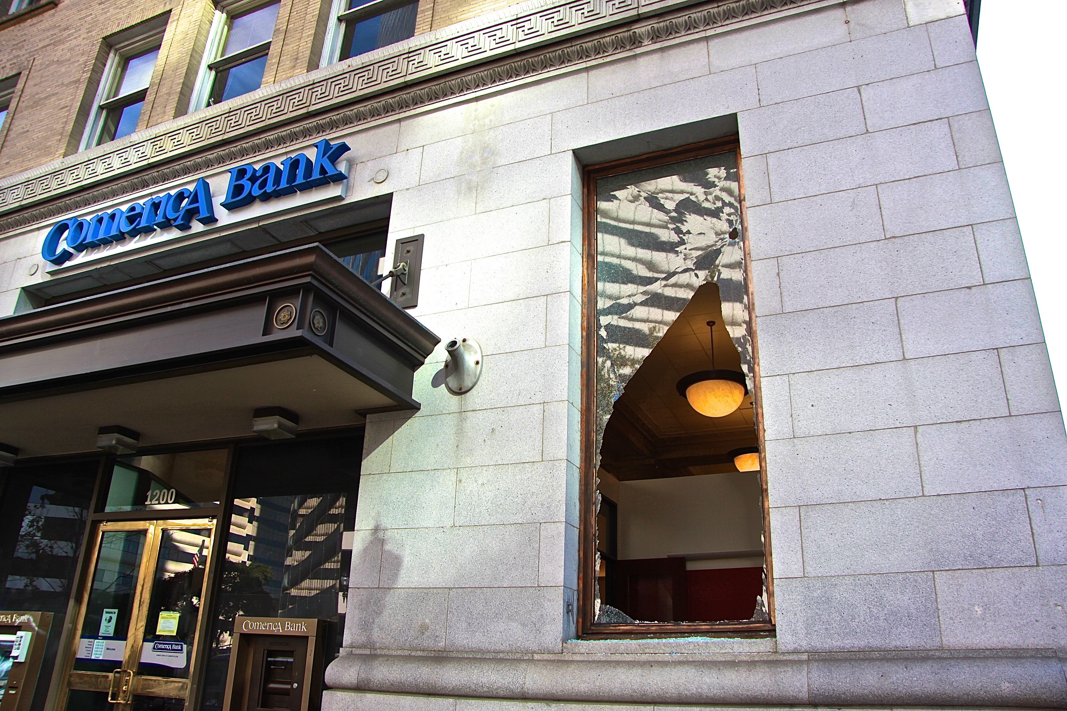 - Comerica Bank’s window is left with a gaping hole after being smashed by protestors last night. A sign on the bank’s front doors read, “This office is closed due to an emergency.” Photo by Jacqui Ipp.