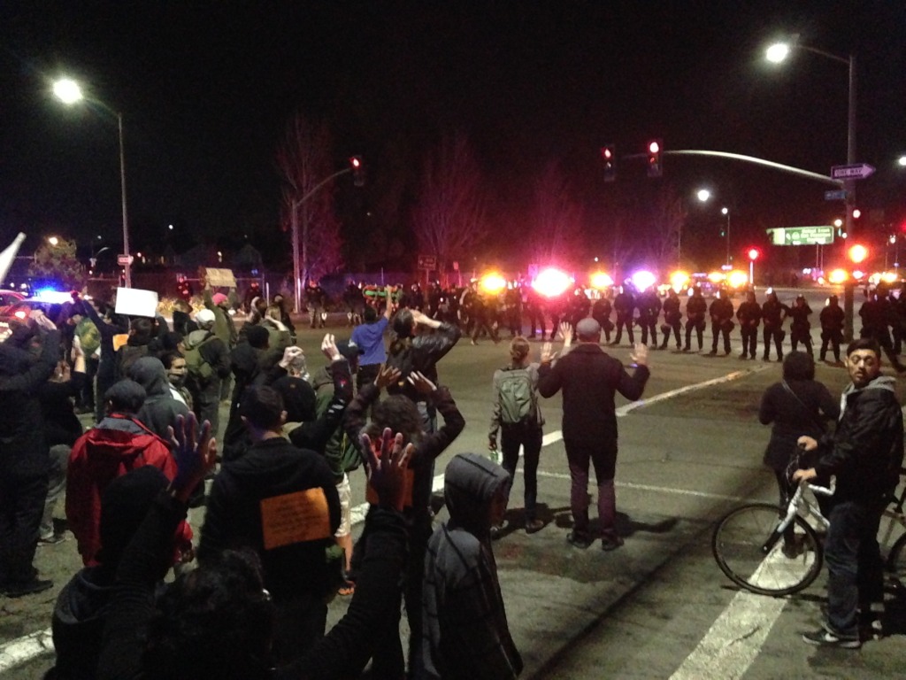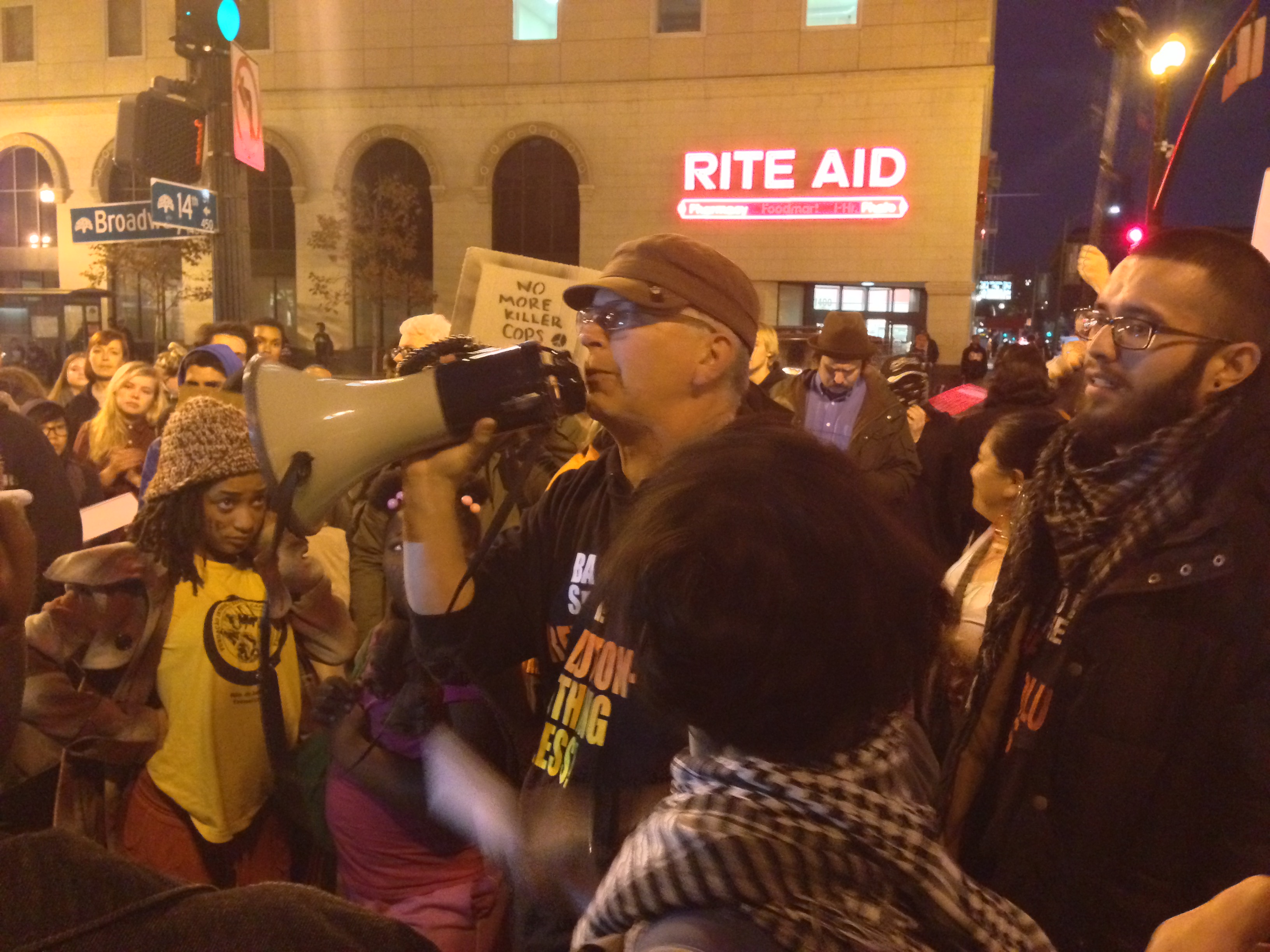 Monday night’s demonstrations in Oakland, immediately following the announcement that a grand jury would not indict police officer Darren Wilson for the shooting of 18 year old Michael Brown, had been sizeable and heated, leaving smashed windows downtown and resulting in what police said were 43 arrests. Tuesday’s events began more quietly, at around 5:30 PM, with a group of 200 protesters huddled around a megaphone on the corner of 14th Street and Broadway, airing grievances and chanting about justice.