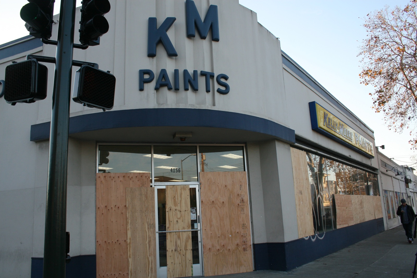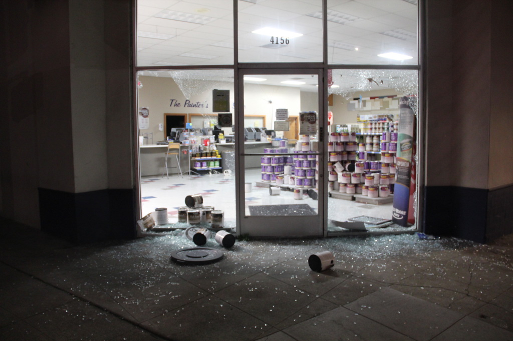 - Shopkeepers worked quickly to repair damages. By morning, the windows at Kelly Moore had been boarded and the glass swept, but the paint remained covering the streets. Photo by Joshua Escobar.