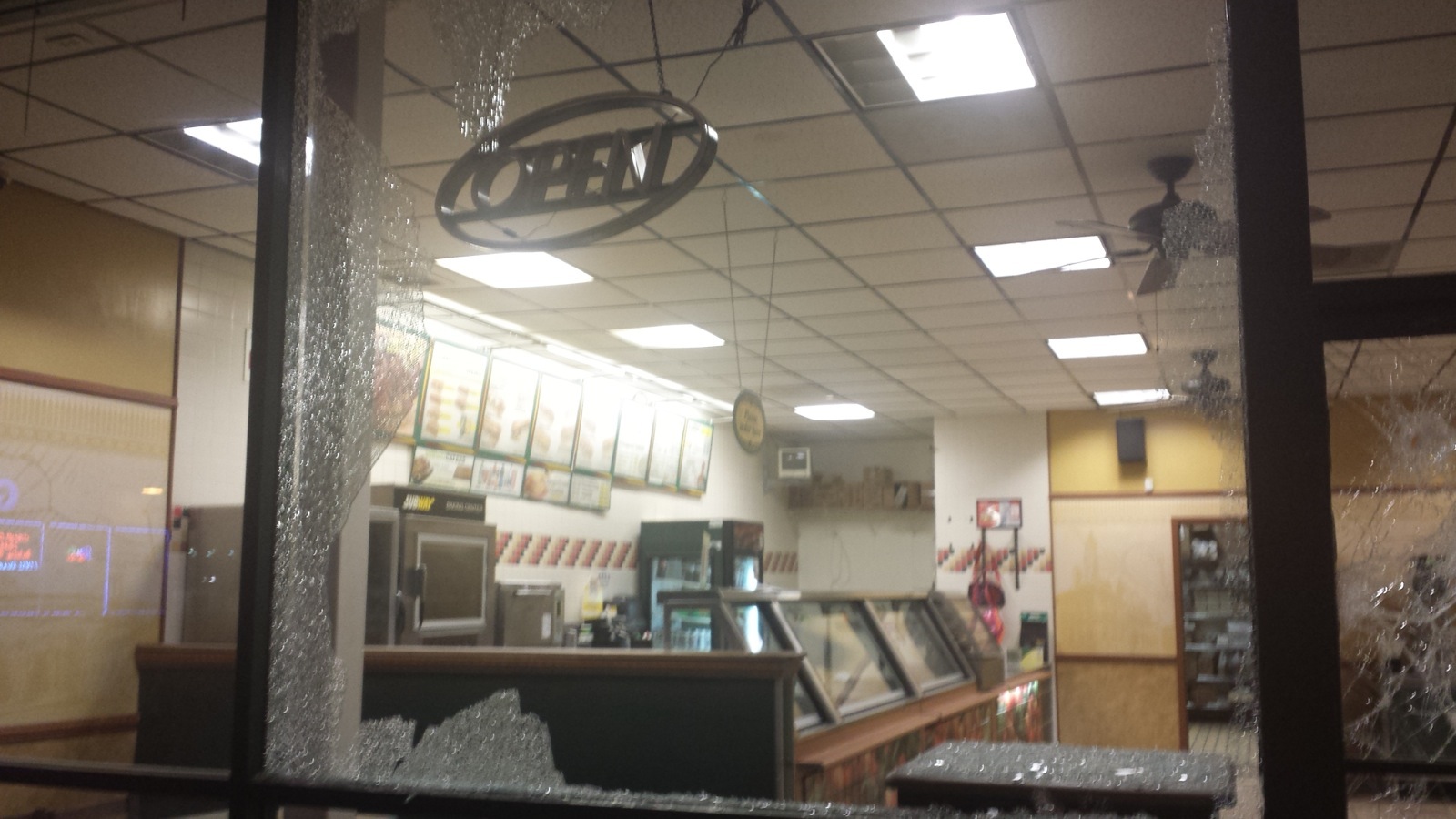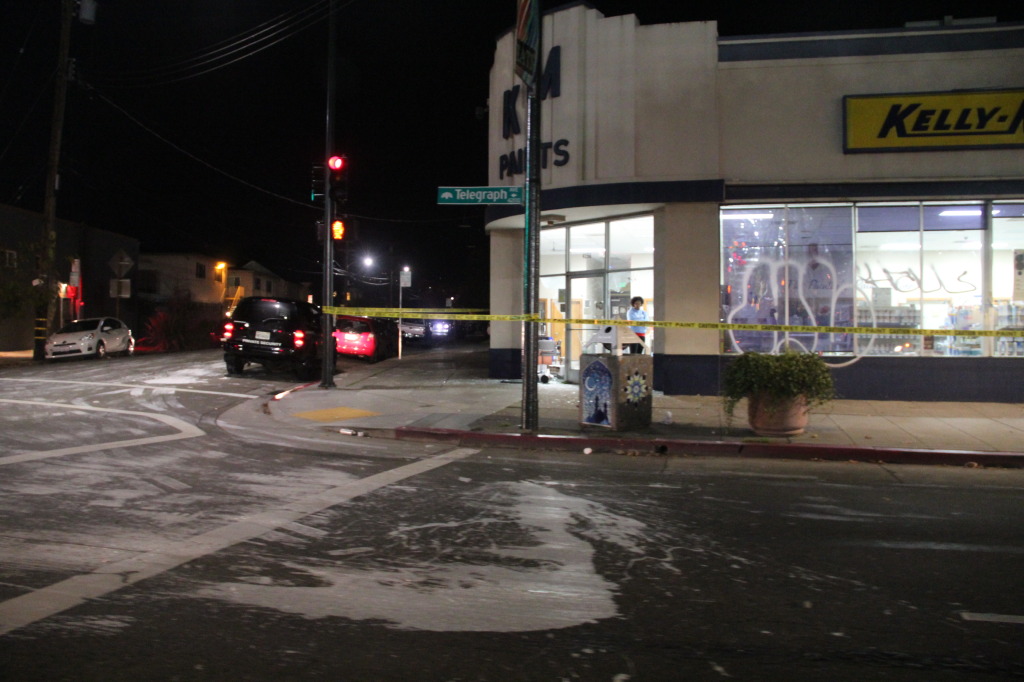 - The Subway on Telegraph was one of several businesses hit by vandals Tuesday night. Most of the glass windows were shattered and police officers were standing guard at 11 PM. Photo by Alissa Greenberg.