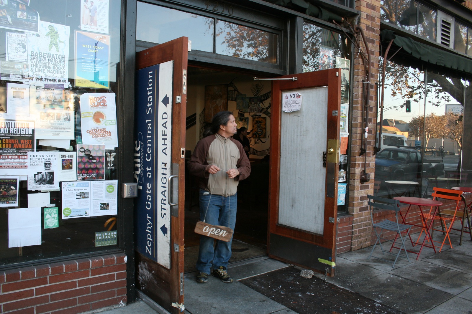 - Eric Marquez stands before his Temescal cafe, Arbor, which was vandalized Tuesday night. Photo by Joshua Escobar.
