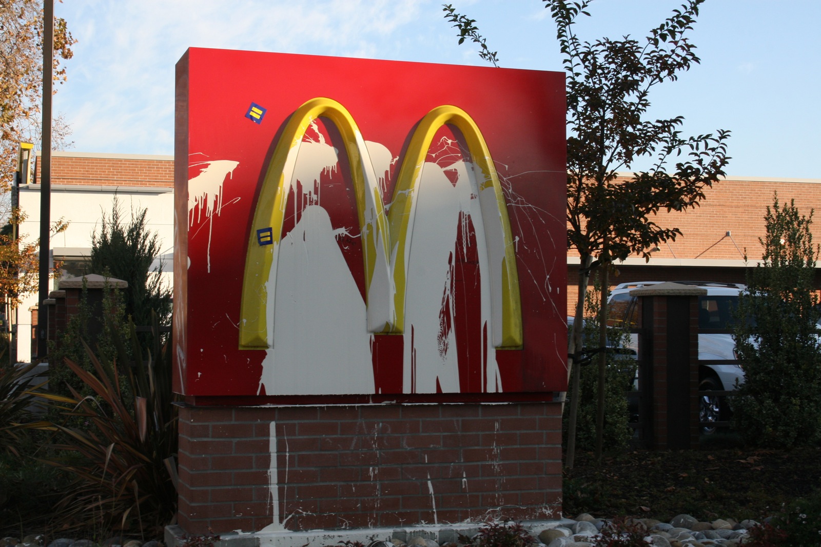 - Protesters also threw paint at the nearby McDonald’s sign. Photo by Joshua Escobar.