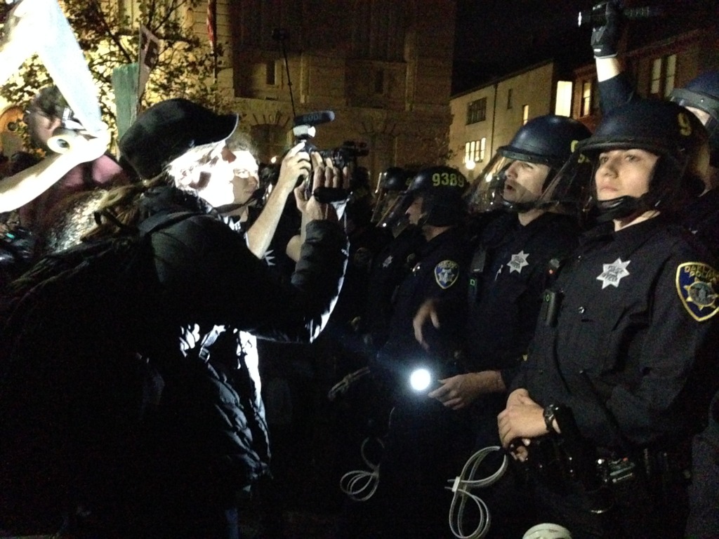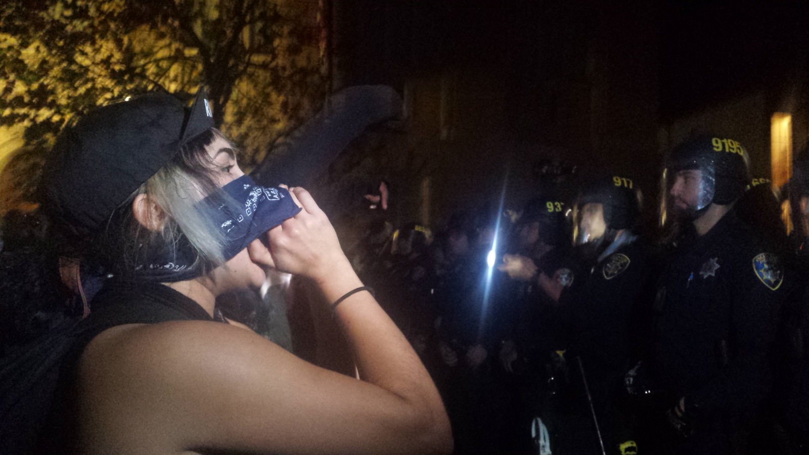 Protesters then moved toward the freeway a second time. But California Highway Patrol officers were standing shoulder-to-shoulder at the intersection of Castro and the freeway, blocking off the entrances. At this time, Oakland police officers could be seen to carry plastic wrist ties, indicating potential arrests. A few officers also wore gas masks.
