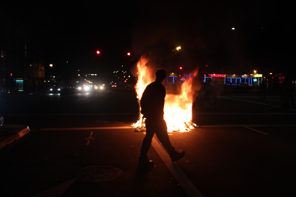 - Some protesters started small fires, often setting fire to the contents of trash bins. Photo by Brett Murphy.