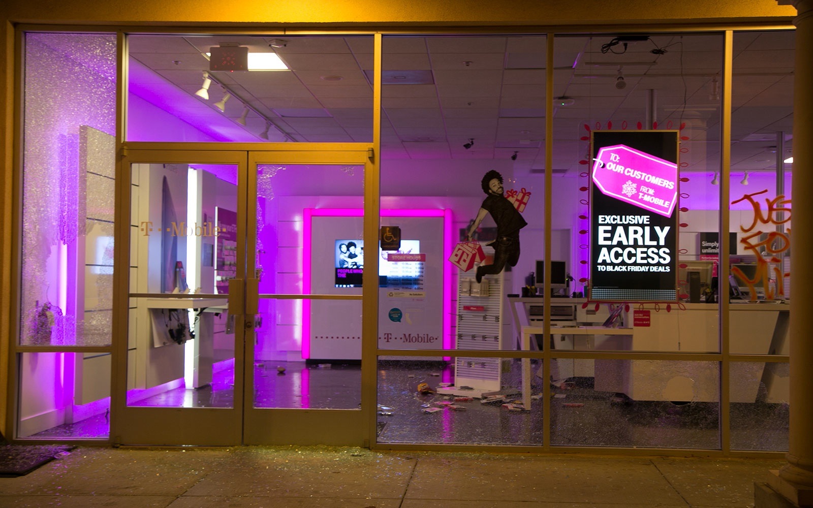 - More smashed glass at the T Mobile store in the Temescal. Photo by Alyssa Jeong Perry.