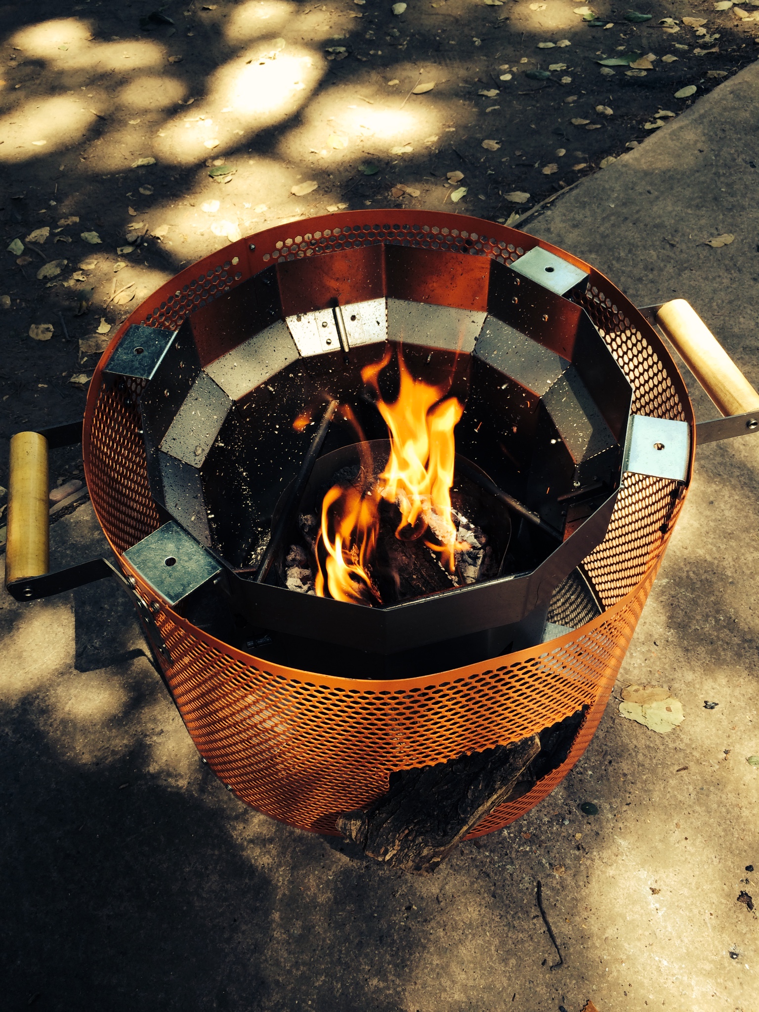 The stove is cylindrical, about the size of a recycling bin, and weighs 11 pounds. It has a curved windshield made of steel. There is a wood pit, “a fire room,” in the bottom; the fire room is separated from the pot by pieces of steel in the shape of a triangle.
