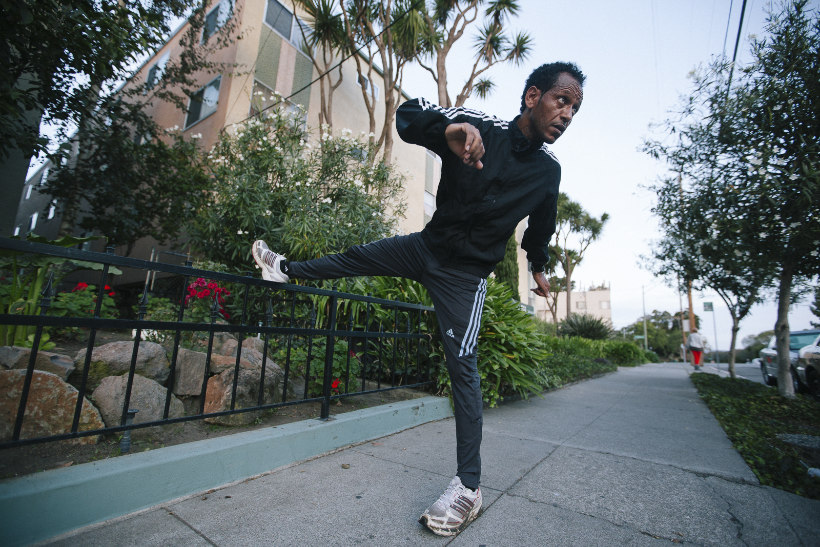 - Habte stretches in front of his apartment after running an eight mile double-loop around Lake Merritt, as he does every morning. He began running at 22 and from 2004-2006, raced professionally, sponsored by Adidas.