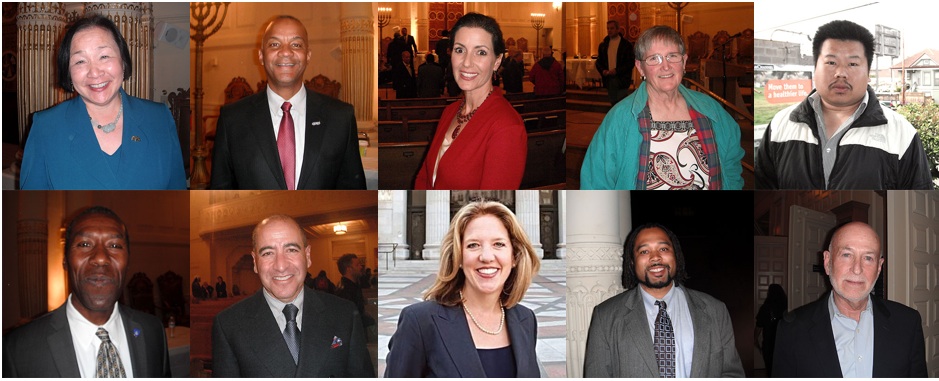 - Parker, Tuman and Quan pose with other Oakland mayoral candidates, including fellow frontrunners Rebecca Kaplan and Dan Siegel plus a few write-in hopefuls, for a photo taken by blogger and event moderator Zennie Abraham, moments before the Giants win the World Series. Photo by Sasha Lekach.