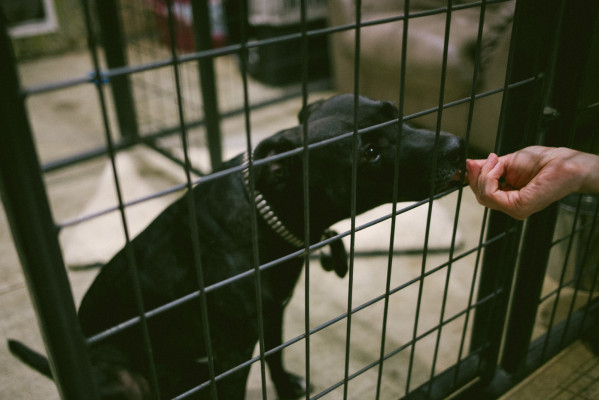- A rescued pit bull is fed by a shelter volunteer in Oakland. Photo by Romin Lee Johnson.