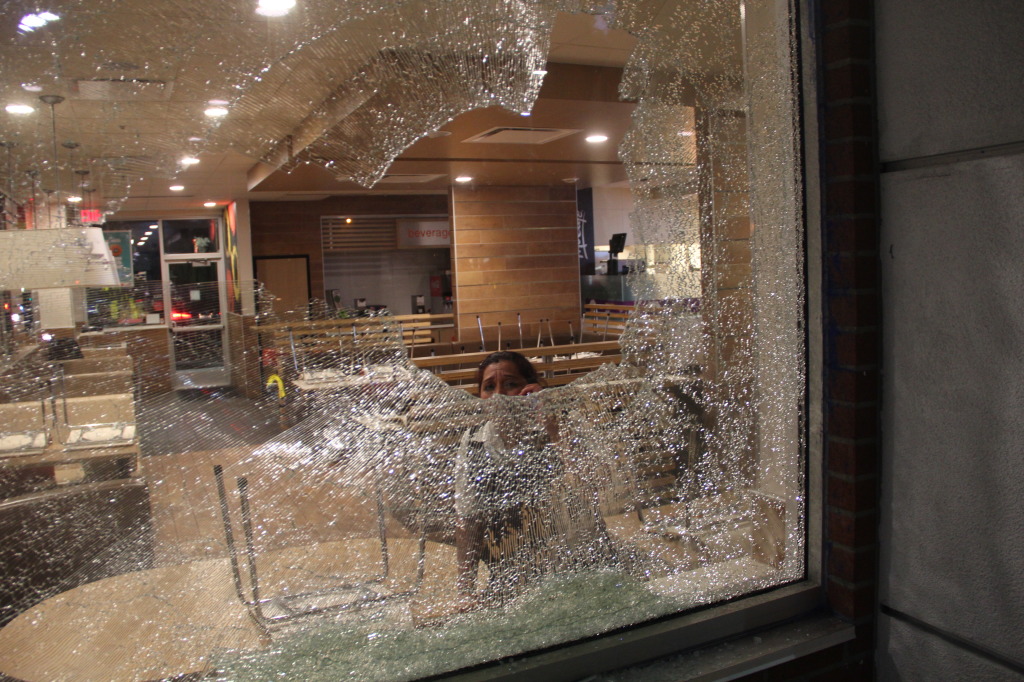 - At the McDonald’s on Telegraph Avenue, protesters broke a glass window. Photo by Brett Murphy.