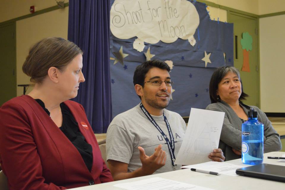 - Rebecca Brown, Principal Nima Tahai, and Hedy Chang discuss a new report about attendance in Oakland Schools. Photo by Ryan Phillips.