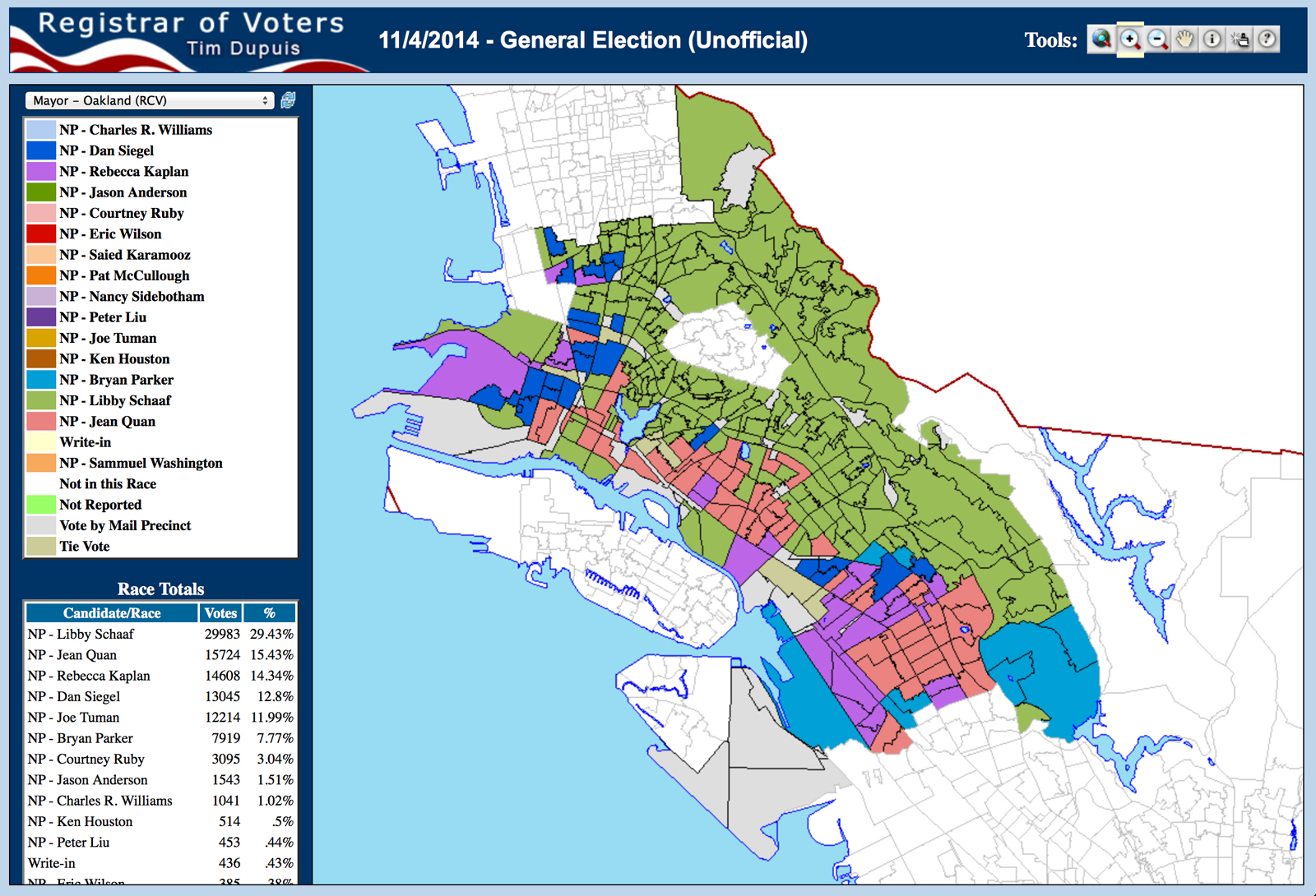 - A screenshot of the Alameda County Registrar of Voter’s map of the recent mayoral election in Oakland.
