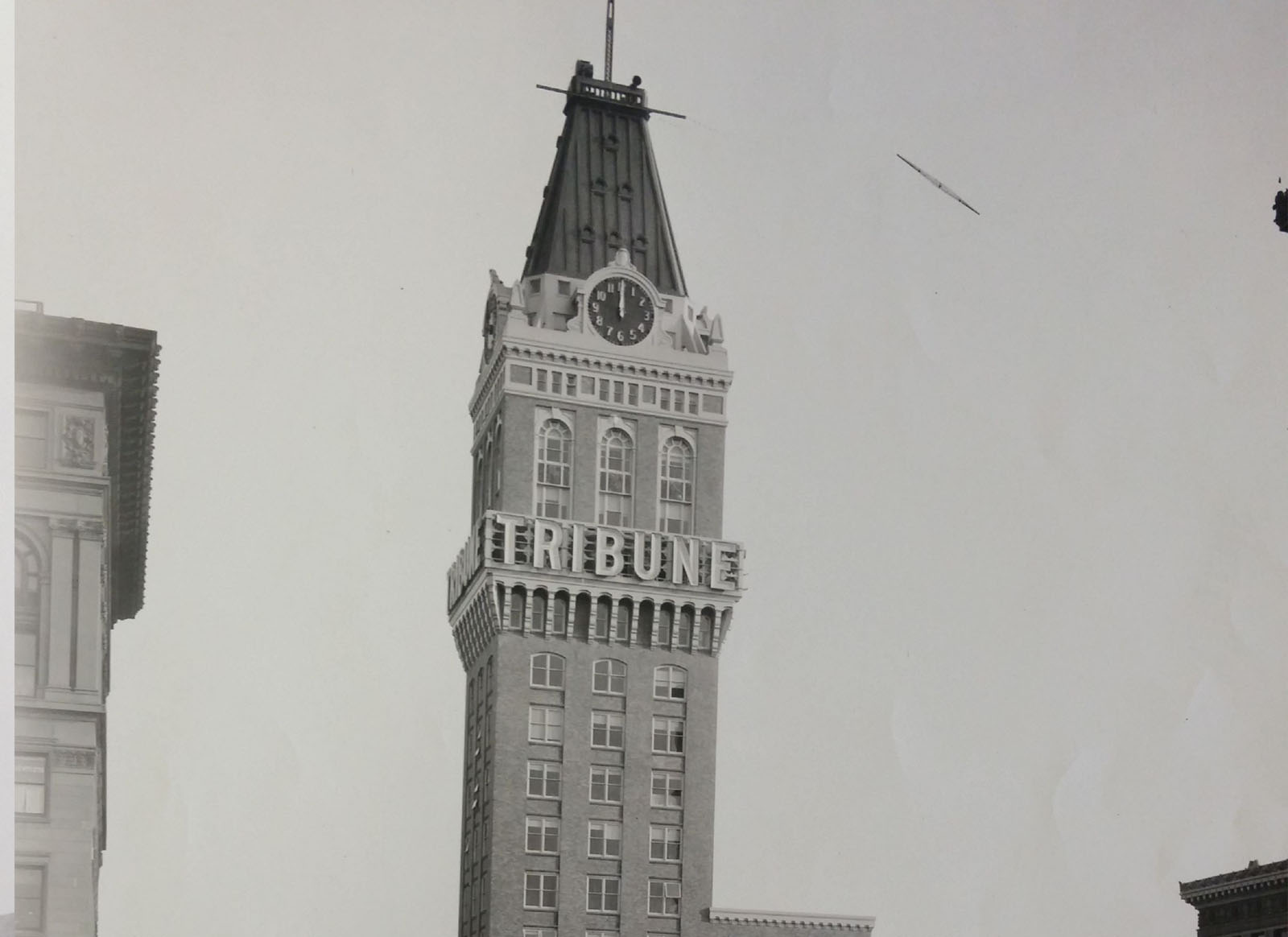 The eleven-foot tall neon letters that read “Tribune” across all fours sides of the 16th floor began to shine bright in 1918. The letters and fifteen-foot clock were first installed on the six-story building. The letters were re-installed on the 16th floor and clock on the 20th floor of the Tribune Tower after it was built. Each number on the clock is 26 inches tall. The hour hand is six feet and three inches long and it weighs about 35 pounds; the minute hand is nine feet and two inches long and it weighs over fifty pounds according a 1918 article in the Journal of Electricity. In a short 1918 article, the Tribune describes the tower and electric sign as “the first of its kind in Oakland.”