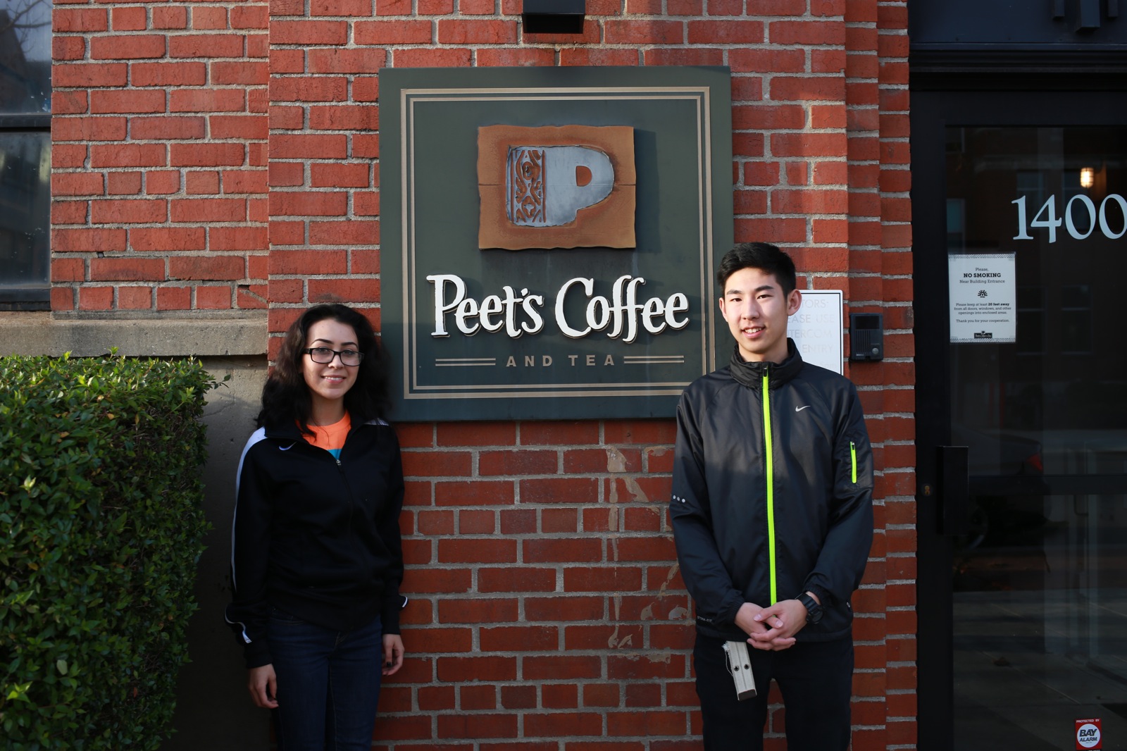 - Allan Qin and Michelle Villegrand, both students at Skyline High School, stand in front of Peet’s Emeryville headquarters, where they both have internships. Photo by Nina Zou.