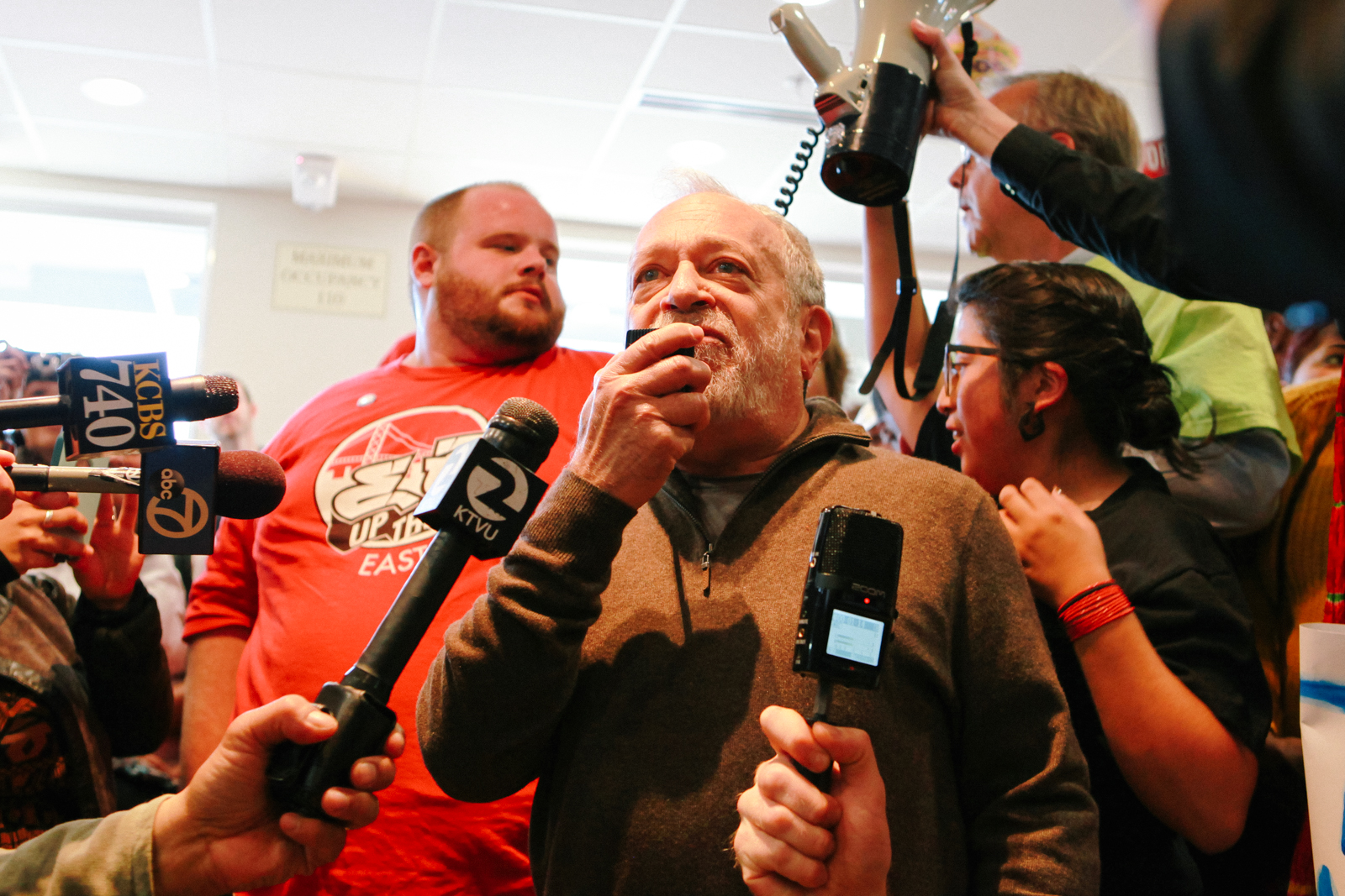- Robert Reich, former U.S. Secretary of Labor and a professor of public policy at UC Berkeley, speaks to protesters in a McDonald’s on Telegraph Avenue in Oakland. (Photo by Bonnie Chan)