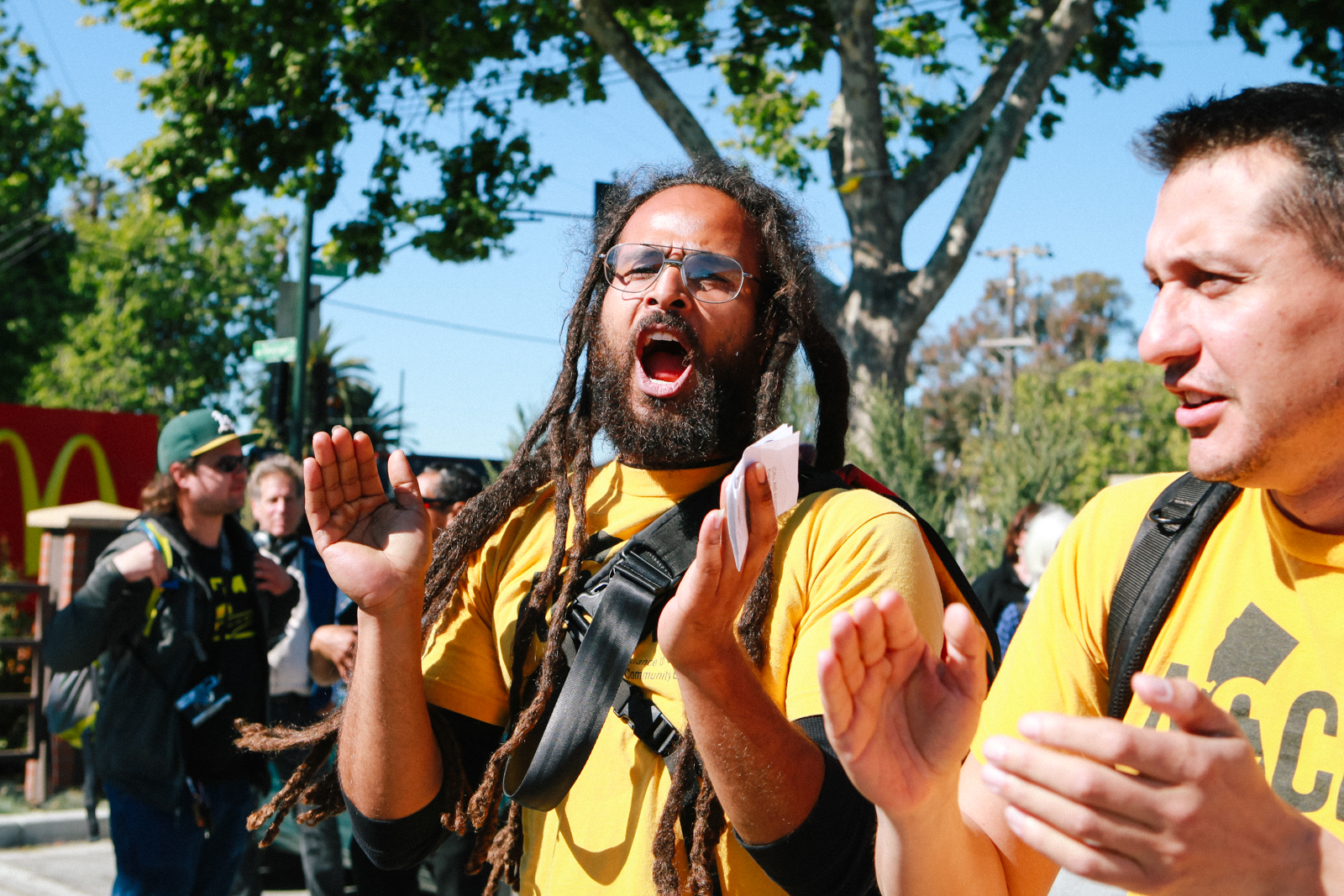 - Isaiah Toney, an organizer with ACCE, chants in the parking lot of a McDonald’s on Telegraph Avenue at 45th Street in Oakland. (Photo by Bonnie Chan)