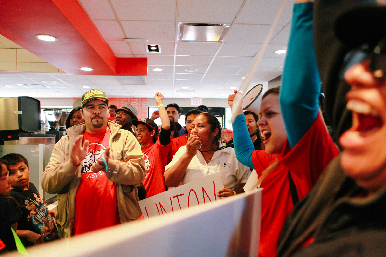 - Fast food workers protest inside a Taco Bell in Richmond. (Photo by Bonnie Chan)