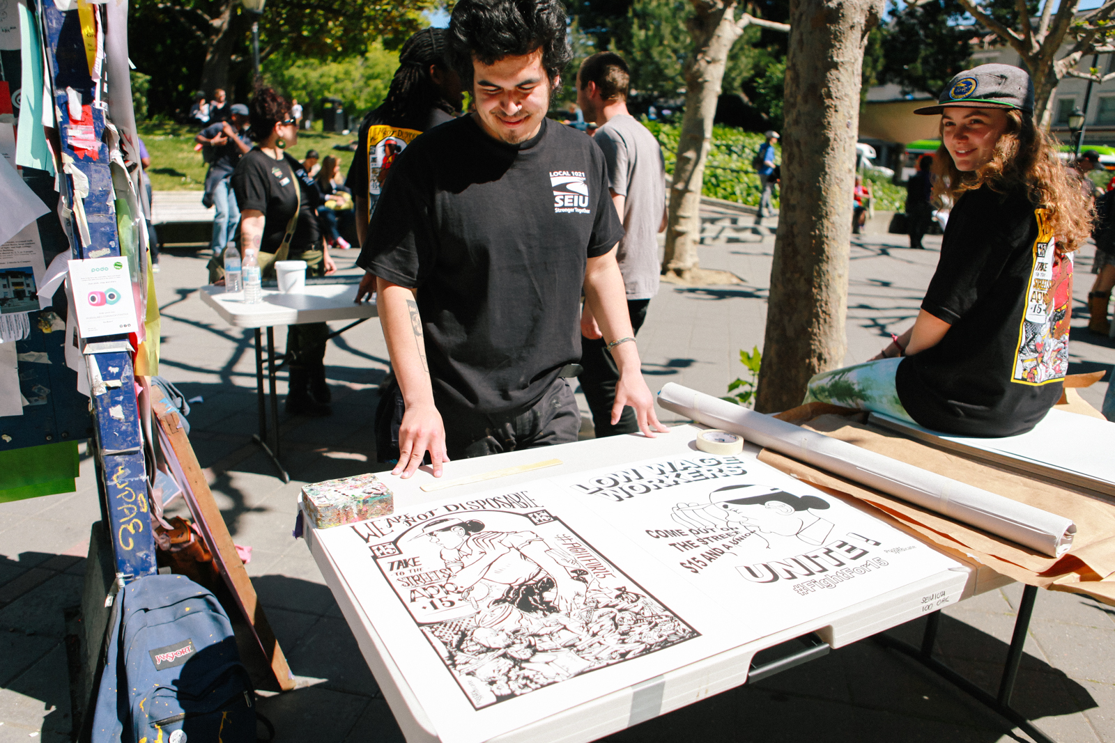 - Artist Christian Costello, center, designed posters that were screenprinted onsite at the “Fight for $15” rally on Sproul Plaza. (Photo by Bonnie Chan)