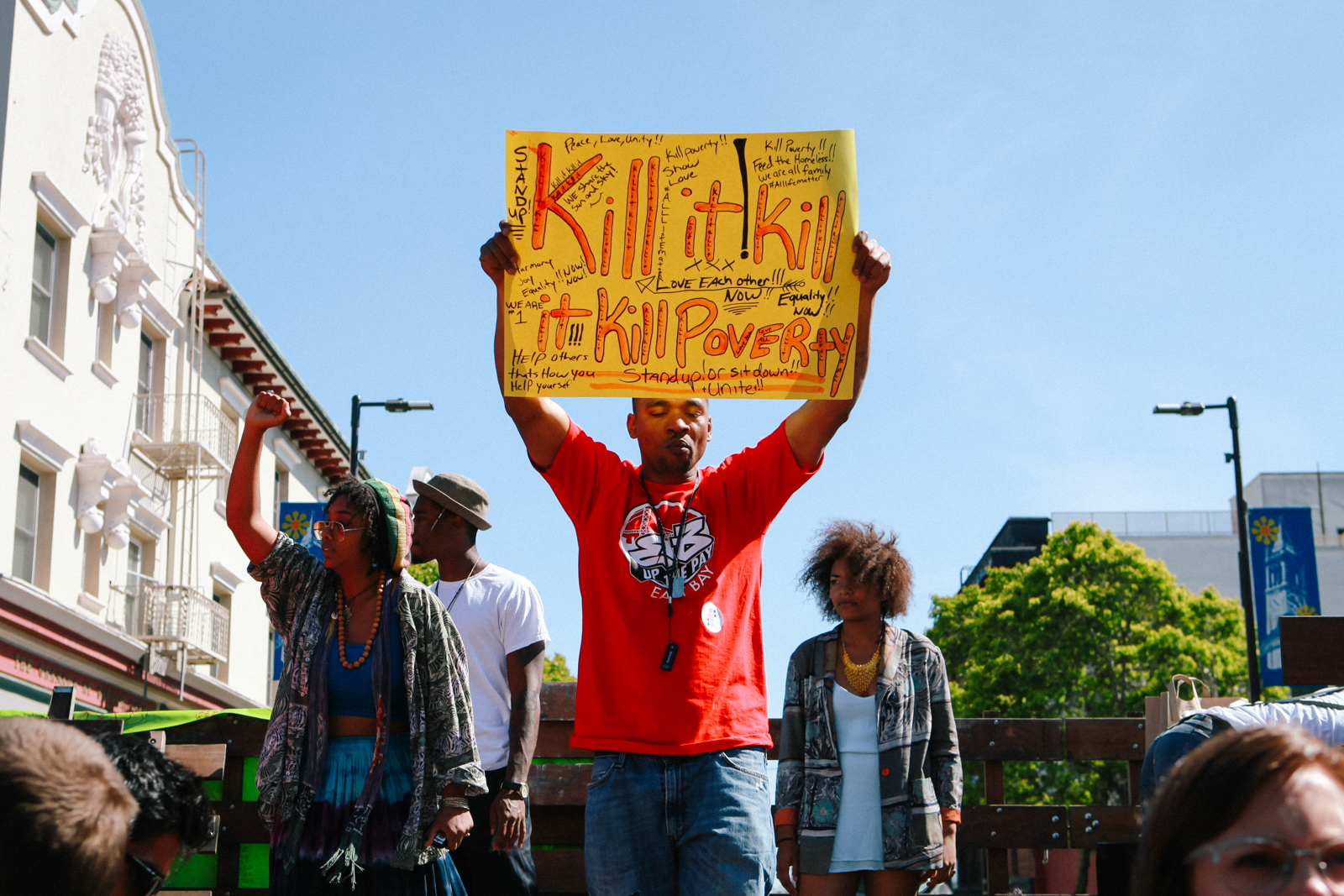 - A demonstrator holds a sign reading “Kill Poverty” at a rally on Sproul Plaza. (Photo by Bonnie Chan)